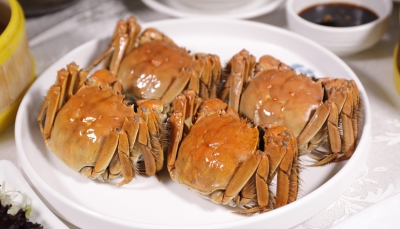清蒸江蘇六兩大閘蟹。(香港中通社記者 黃璇攝) 最令人期待的“清蒸江蘇六兩大閘蟹”上桌時,各位都忍不住細看每隻蟹的膏黃,果然個個膏豐肉厚。值得一提的是,這裡特設拆蟹服務,專人細心去除蟹殼,只留精華,讓食客可以優雅品嚐每一絲蟹肉,無需動手,感受純粹蟹鮮。
