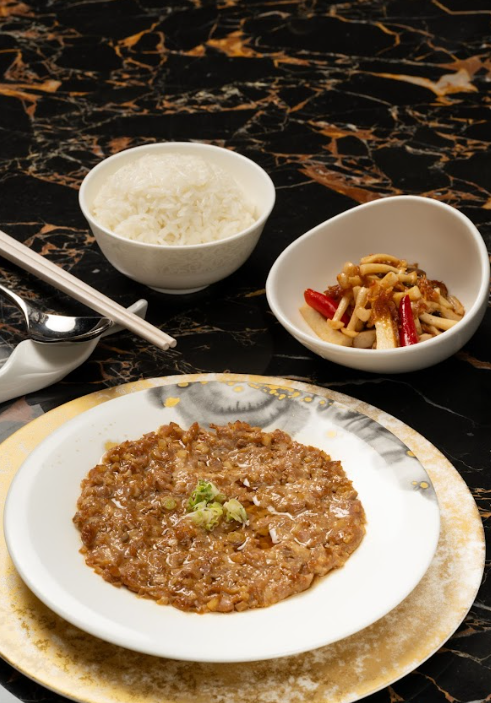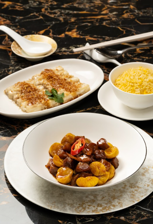 大地魚乾栗子炆豚肉粒,蒜香茄子配蛋炒飯。 大地魚乾栗子炆豚肉粒,蒜香茄子配蛋炒飯:以大地魚乾的獨特鮮味,搭配軟糯栗子與豚肉粒,為你帶來充滿家常風味的傳統菜式。 港式土魷蒸肉餅配XO醬炒雜菇配白米飯:將土魷的鹹香融入經典肉餅,配上香辣惹味的XO醬炒雜菇,呈現令人回味無窮的港式滋味。