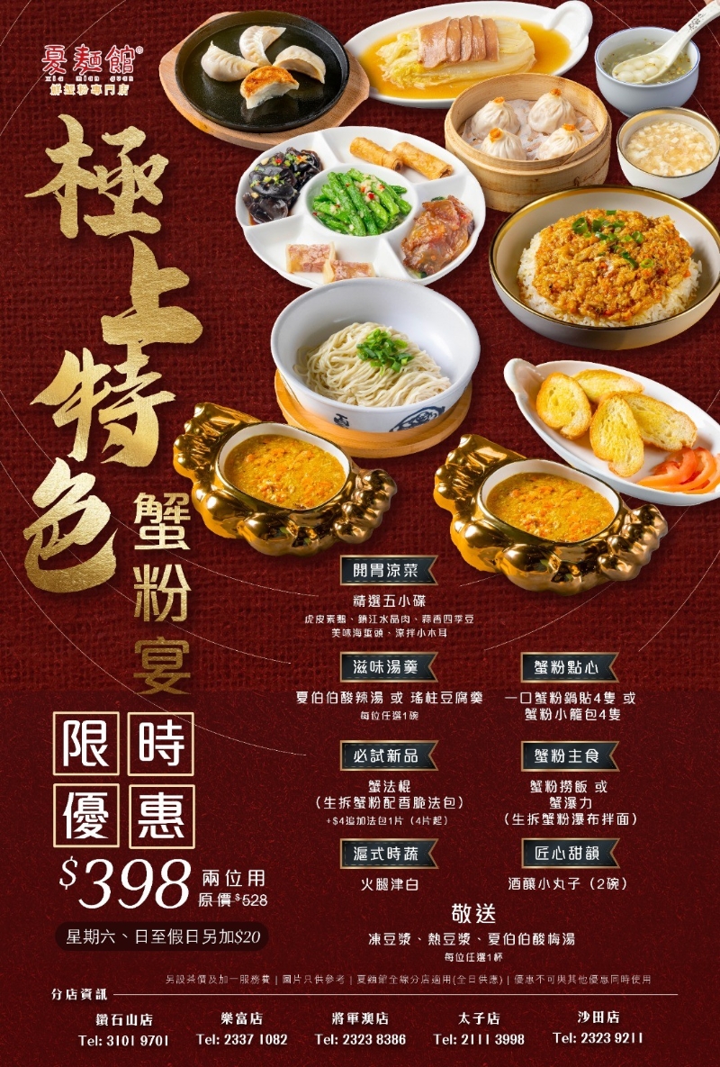 香港新聞網12月15日電 上海傳統名菜餐廳“夏麵館”近日為蟹迷們帶來驚喜,推出四款全新鮮拆蟹粉菜式,讓食客享受金黃濃郁的蟹粉盛宴。夏麵館自設蟹場,直送新鮮蟹貨至香港,是香港本地知名的蟹粉專門店。所有菜式使用現拆蟹粉及蟹肉,由專業師傅每日手工處理,不使用冷凍蟹粉,確保蟹膏橙黃豐滿,蟹肉鮮甜彈牙,完美呈現蟹的原始鮮味。 成立於1999年的夏麵館,以自家製麵條聞名,並堅持不使用味精,迎合現代健康飲食趨勢。該餐廳於2006至2008年連續三年被評選為“上海最佳食府”,目前在香港擁有五間分店(將軍澳、樂富、鑽石山、太子、沙田),受食客及名人喜愛,包括唯靈和李純恩等食家曾推介。