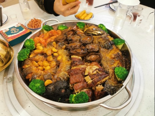 蝦的粵語發音與“哈”同音,寓意笑口常開;魚代表年年有餘,年糕象徵步步高升,豬手寓意橫財就手;“無雞不成宴”,雞與“吉”諧音,寓意吉利或“有計”。此外,蠔豉(寓意好事)、髮菜(寓意發財)、盆菜(寓意闔家團圓)等,也都是好吃又吉利的香港特色團年飯菜色。