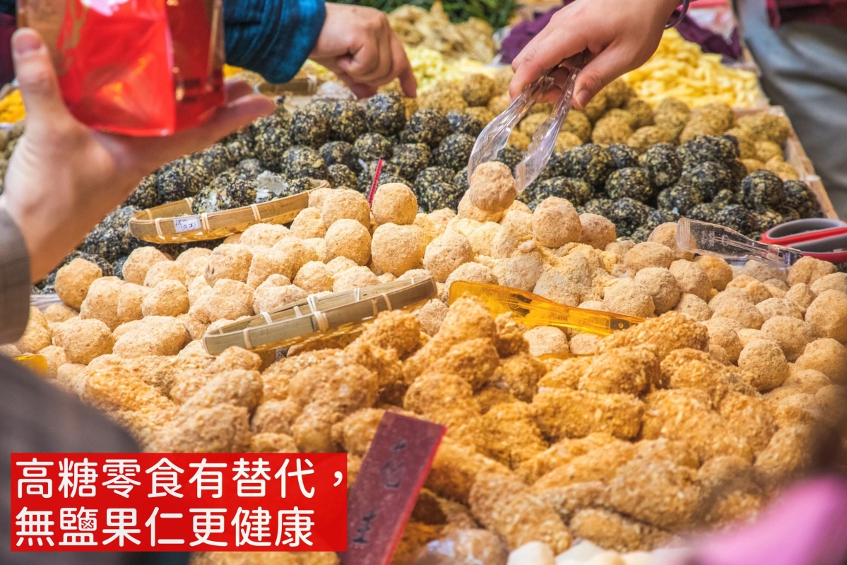 傳統全盒裡的“糖三寶”,高糖陷阱不可小覷。 傳統全盒裡的“糖三寶”——糖冬瓜、糖蓮子、糖蓮藕,象徵甜蜜美滿、連生貴子,但其高糖陷阱不可小覷。這些食品製作時經濃糖漿浸泡乾燥,一小塊已含兩至三茶匙糖分,超標的糖攝取易增加蛀牙、代謝疾病及肥胖風險。世界衛生組織建議,成人每日添加糖(或游離糖)攝取不宜超過總能量的10%。想延續甜蜜寓意,其實可以選用無添加糖的乾果,如杏桃乾、芒果乾,不僅低糖還多了抗氧化物與天然纖維,有益腸道健康。希望添丁的家庭,建議以原味烤蓮子取代糖蓮子,因為未經糖漿處理的堅果類食物,蛋白質和礦物質含量較高,更能滿足身體營養需求。 另一類常見的全盒食品是果仁和瓜子。紅瓜子(葵花籽)象徵喜悅,富含有益心臟的不飽和脂肪和維他命E。開心果與腰果則有“開心幸福”一說。專家建議選無鹽、烘烤製品,控制鹽分攝取,可適量享用並幫助血糖平穩。以混合果仁作為全盒主角,不但美味,也更容易守住健康飲食底線。