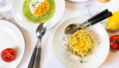 溫有成師傅 (Edward Voon) 。 溫有成師傅 (Edward Voon) 出生於馬來西亞檳城,成長於新加坡,曾獲世界美食高峰會頒發“年度新晉主廚”及“年度主廚”等殊榮,廣受城中名人歡迎,實力與聲望毋庸置疑。他擅長以法式精細的烹調技巧,注入亞洲飲食文化元素,以無限創意重新演繹新加坡的多元風味與港式粵菜的細膩工藝,匯聚三地料理精髓,炮製出一道道層次豐富、風味獨特的創意佳餚。 南洋風味的創意變奏 溫主廚將呈獻一系列特色前菜沙律、熱盤、甜品及即煮美食。油甘魚配梅子番茄及蔬菜凍湯清新怡人,番茄及青瓜恰好中和油甘魚的油脂感,為盛宴開啟味蕾。其他精選還有海南雞沙律配紹興酒啫喱及芝麻醬、香辣魷魚大蝦沙律、薯仔沙律配南乳豬肉、娘惹咖哩牛肉沙律,以及西班牙伊比利亞豬肉沙律配香料乳酪及椰菜花,酸辣清爽,格外醒胃。