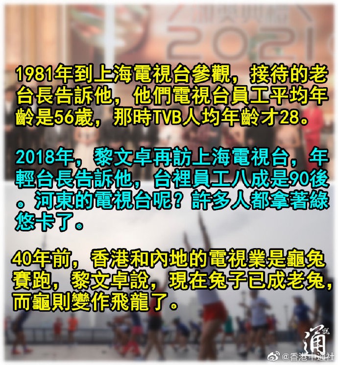 她稱,友人黎文卓是個有40年傳媒經驗的電視人,這陣子因為工作關係要上內地,酒店隔離期間每天看足8小時內地電視節目,看出了他眼中的河東與河西,無限感慨。時光機回到了1979年,黎文卓當時是TVB皇牌節目《歡樂今宵》的創作成員,這一年,《歡樂今宵》第一次到內地拍攝,在廣州搞了個名為“羊城賀歲萬家歡”的現場直播節目。這節目,是國家改革開放後第一次有香港藝人踏足內地表演的晚會,更是全國直播。全國人第一次看到資本主義下的娛樂事業是何模樣,更為日後兩地影視文化的交流打開大門。 黎文卓回憶說,當年廣州是中國第三大城市,省電視台竟然沒製作能力自行承辦戶外直播,於是TVB就動用兩個貨櫃車,把器材從香港運到廣州,那次出動,幾乎掏空了半間電視台的設備。還有一回,黎文卓到杭州拍攝錢塘江大潮,因為杭州電視台沒有一部合標準的專業攝錄機,而攝製隊只帶了一部攝影機來杭,結果,他們要在上游拍完主潮,立即飛車趕往下游拍潮尾,一機走天下的追潮故事,仍歷歷在目。由一部標準機都沒有的日子,演變成今天驚人的河西:現在內地一個普通真人秀節目,為了跟拍每個參賽者,電視台隨時出動廿多部攝影機追踪拍攝。 黎文卓還記得,1981年到上海電視台參觀,接待的老台長告訴他,他們電視台員工平均年齡是56歲,那時TVB的人均年齡才28。2018年,黎文卓再訪上海電視台,年輕台長告訴他,台裡員工八成是90後。河東的電視台呢?許多人都拿著綠悠卡了。40年前,香港和內地的電視業是龜兔賽跑,黎文卓說,現在兔子已成老兔,而龜則變作飛龍了。 “上星期看郭富城在TVB台慶演出,是驚喜,也是感慨。”屈穎妍感歎:“台前幕後,賣的仍是老本,希望我們這頭老驥只是伏櫪,總有一天會再醒來,而不是失望棄賽。” 【編輯:刘春】