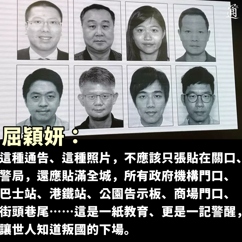 香港新聞網7月24日電 香港警方國安處早前懸紅各100萬元(港幣,下同),通緝包括羅冠聰、郭榮鏗在內的8名國安逃犯。羅冠聰、郭榮鏗及蒙兆達的家人被警方國安處帶走調查。近日,香港媒體人屈穎妍發文感慨,叛國不是玩泥沙,下場可以牽連甚廣,這是國際標準,放諸四海皆一樣。這8個通緝犯,就是人辦,相信這種調查只是開始。全文如下: 警方公布全球通緝8名國安嫌疑犯,很多被遺忘的2019暴亂記憶又再湧現眼前。日前通緝犯羅冠聰、郭榮鏗及蒙兆達的家人被警方國安處帶走調查,大家都說:終於等到今日。 善有善報,惡有惡報,若然未報,時辰未到。2019年黑暴時,香港好多人咬牙切齒、敢怒不敢言,大家都說:公義在哪裡?正邪為什麼沒了界線?是非黑白何以全被顛倒? 4年後的今天,時辰終於到了。 那天赴深圳,在關口看到八大通緝犯的照片,忽然覺得,香港政府實在太善良。 這種通告、這種照片,不應該只張貼在關口、警局,還應貼滿全城,所有政府機構門口、巴士站、港鐵站、公園告示板、商場門口、街頭巷尾……這是一紙教育、更是一記警醒,讓世人知道叛國的下場。
