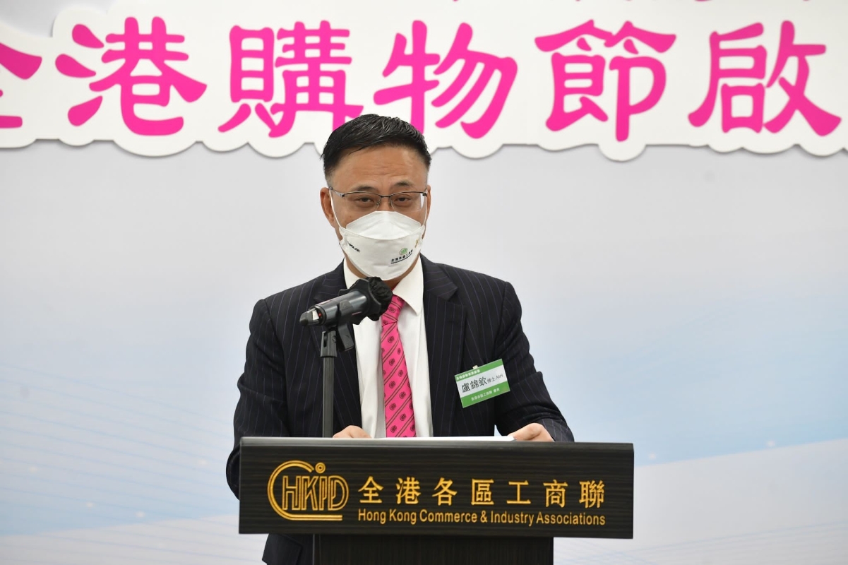商務及經濟發展局副局長陳百里致辭 圖源:香港商报 陳百里指出,本港消費市場六成來自本地、四成來自旅客,過去兩年消費市場大受打擊,尤其是中高檔市場,政府剛推出的第二輪消費券,為零售及餐飲業帶動150億元消費力,近年政府積極推動電子支付,今年頭8個月本港透過電子支付的消費額已達200億元,比去年增22%,比前年增加77%,增長速度很大,但仍有很大進步空間,“香港購物節”引入直播帶貨平台,有助促進本港電子支付消費。