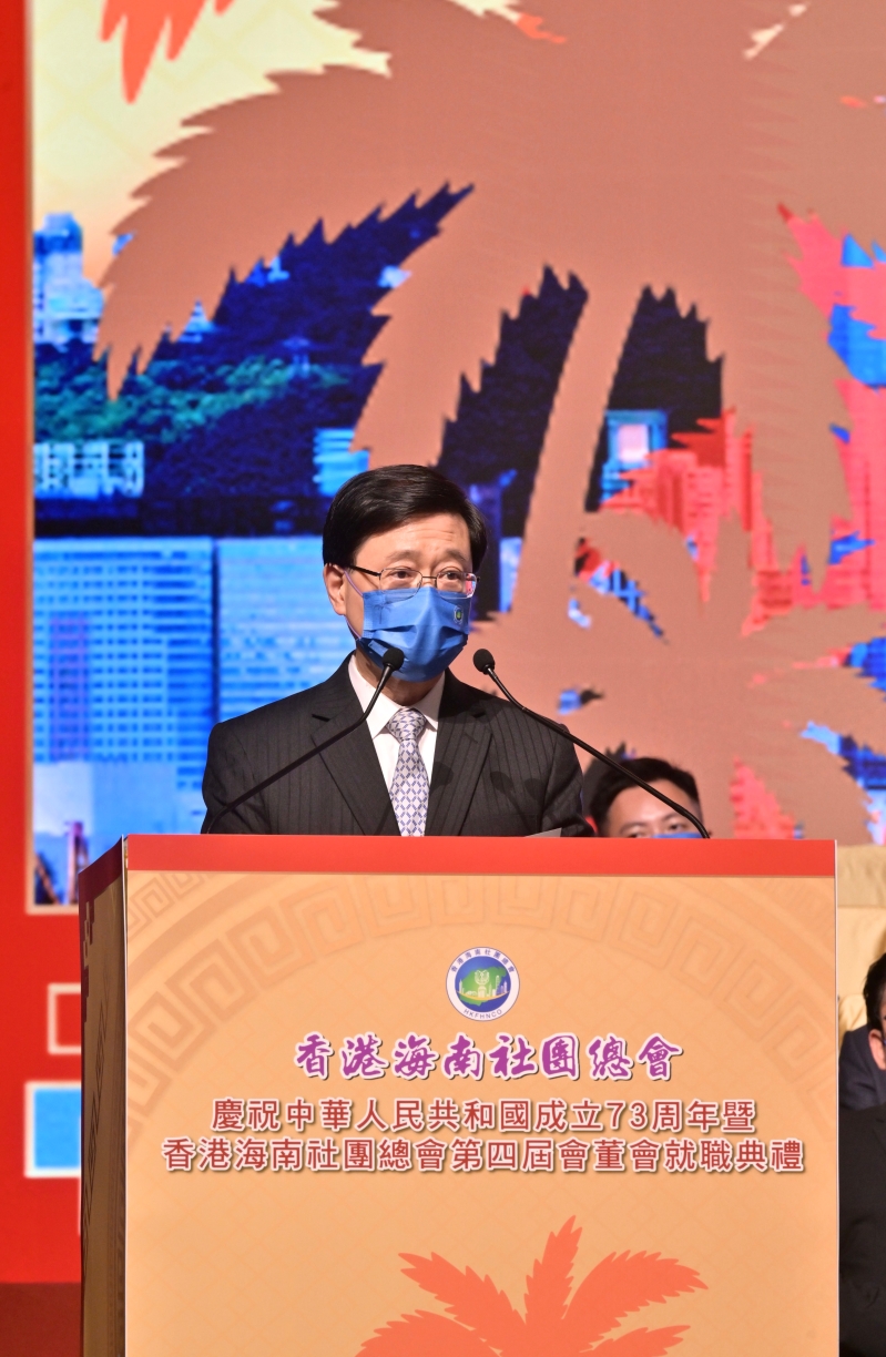 李家超在香港海南社團總會第四屆會董會就職典禮致辭。 香港中通社圖片 李家超表示,香港與祖國同根同心、血脈相連。在“一國兩制”下,香港有背靠祖國、聯通世界的得天獨厚優勢。“十四五”規劃、粵港澳大灣區建設、“一帶一路”倡議等國家重點戰略,讓香港拓展與內地及世界的交流合作,發揮互惠共贏的重要作用。