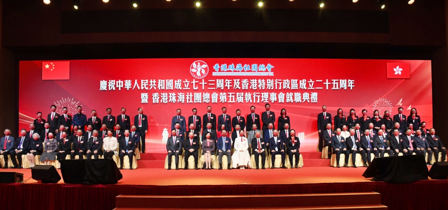 香港珠海社團總會舉行第五屆執行理事會就職典禮,賓主合照。 圖源:香港商報 行政會議非官守議員召集人葉劉淑儀,財政司副司長黃偉綸,政制及內地事務局局長曾國衛,保安局局長鄧炳強,警務處處長蕭澤頤,入境事務處處長區嘉宏,海關關長何佩珊,懲教署署長黃國興,前律政司司長梁愛詩,香港立法會議員、民建聯主席李慧瓊等亦出席。