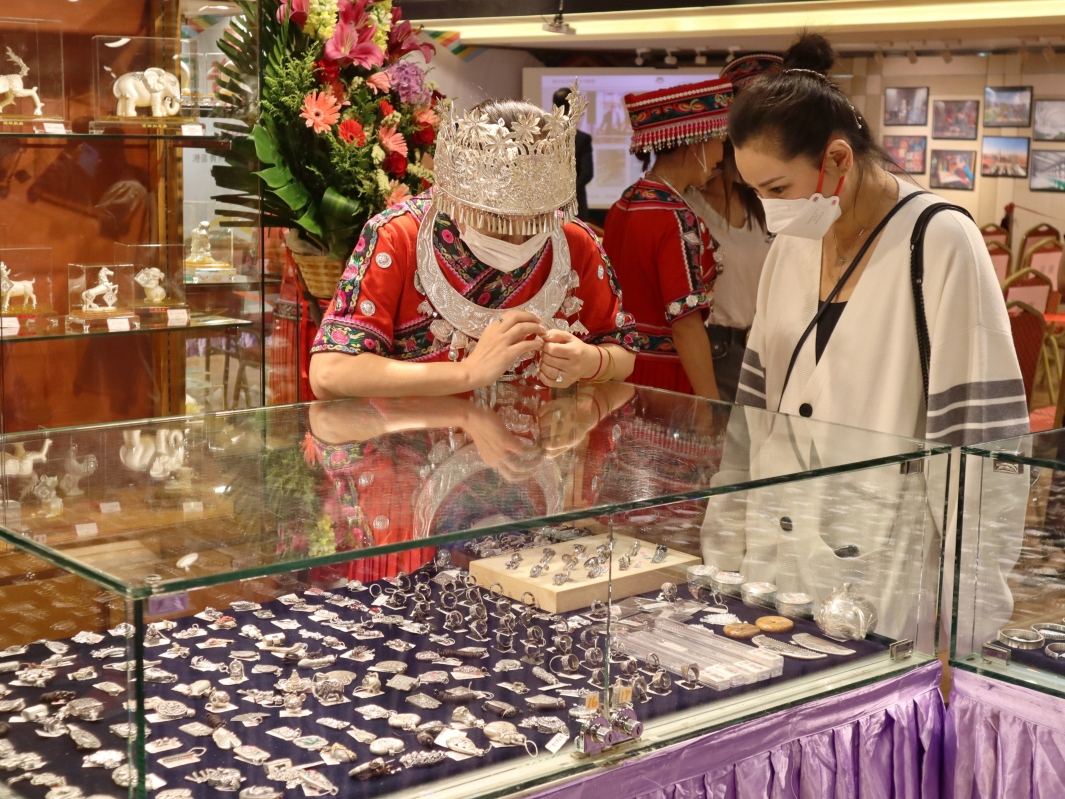 顧客挑選苗銀產品 圖源:香港商報 “第四屆多彩貴州特色商品展銷月”匯聚了眾多具有貴州特色的藝術品,包括大方縣的漆器及苗族銀飾製品、黃平泥哨、紫袍玉、羅甸玉、晴隆玉、剪紙、農民畫、樹根畫、金絲楠木、蠟染及刺繡等,並將集中展銷貴州道地藥材,包括貴州茯苓丁、茯苓塊、貴州天麻片、羅漢果、特級天冬、杜仲、太子參、赤靈芝、紫靈芝、薏苡仁白米、天麻等,以及黔味美食佳釀,包括茅台酒、習酒、糯米酒、綠茶、紅茶、紅薯粉絲、酸湯牛肉粉、辣椒醬、食用菌、金銀花中藥牙膏等。 (完) 【編輯:王軼南】