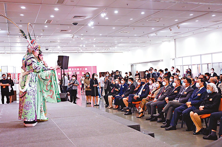 出席嘉賓觀賞粵劇折子戲《胡地蠻歌》非遺項目表演。 圖源:香港文匯報 本次展覽分為3個展區,包括“多彩絲路”—“一帶一路”國家非遺精品展區、“國風潮韻”—中華非遺傳承精品展區,以及“源遠流長”—文房書齋精品展區。3個展區共陳列了超過300件非遺文化代表作與精品,通過中外文化作品的“對話”,體現中華文化“和而不同”、“美美與共”的開放與包容價值觀。 當中,“多彩絲路”展區集中展示了來自“一帶一路”沿線國家的非遺作品,如越南的竹編面具、斯里蘭卡的木製面具與泰國的孔劇面具等;“國風潮韻”展區則展示了來自祖國內地十餘個城市的國家級非遺文化作品與中華優秀傳統文化精品,包括龍袍、彩繪唐卡、楊柳青木版年畫、景泰藍等實物,還有沉浸式的VR體驗,“雲遊”盂蘭勝會虛擬博物館;“源遠流長”展區除展示筆墨紙硯外,還有一組明清古董傢具,如明清書櫃、官帽椅、畫案、羅漢床、花幾、方檯等,引導觀眾走近文人書齋的清雅靜謐,感受中華文化的獨特魅力。