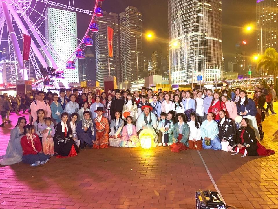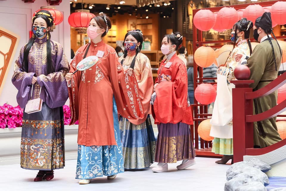 年初奧海城新年主題活動,漢服展示大受歡迎。 圖源:香港商報 “同袍”是漢服愛好者間的互相稱謂,源自《詩經·秦風》中的“豈曰無衣,與子同袍”。“漢服香港”社團成立後,鼓勵“同袍”們在重要節日身著漢服出行。例如每年11月22日“漢服出行日”前後,社團會舉辦相關活動,向香港市民展示漢服魅力。