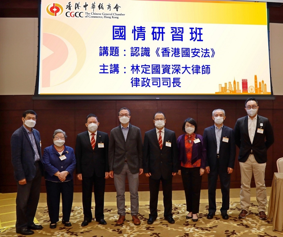 林定國(左四)與中總首長、主要成員合照。 圖源:香港商報 林定國對香港國安法的法律基礎、性質,以至國安法與憲法、基本法、香港其他法律的關係皆作出了詳盡的講解,並與其他地區的國安法律相比較,強調中央為香港維護國家安全立法是合憲、合法、合情、合理的,不會影響香港的高度自治、司法獨立和法治,也不會影響香港市民的合法權益。 林定國指出,某些西方國家對香港國安法立法後香港法治“觀感”帶有負面看法,惟客觀現狀及事實表明,香港依然享有高度法治,香港由亂而治,市民生活得到有力保障。香港國安法的實施與每位市民息息相關,更是準確貫徹“一國兩制”的關鍵因素。 會上多位中總常董及會董踴躍提問,就如何推廣香港國安法、基本法第二十三條立法、香港成立亞太區國際法律及爭議解決服務中心的優勢等問題,與林定國交流意見。雙方都認同讓香港市民,尤其是青少年正確認識香港國安法,提高國家安全意識和守法意識的工作十分重要而必要。
