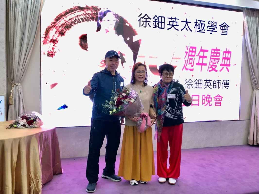 慶典晚會上,太極師傅施雄鵬(左起)、徐鈿英、潘慧君。