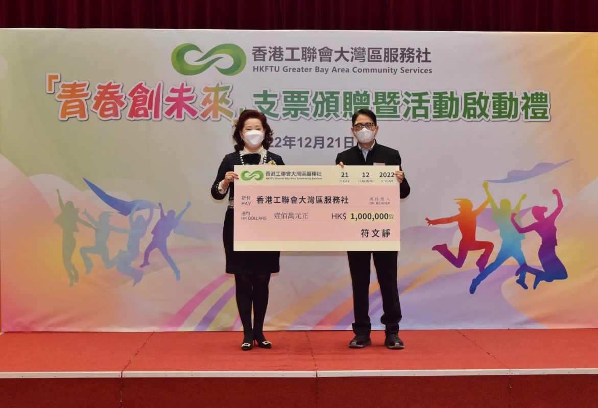 香港新聞網12月23日電 香港工聯會大灣區服務社(灣區社)計劃明年到中學及大專院校,舉行生涯規劃活動,並於21日舉行“青春創未來”支票頒贈暨活動啟動禮,感謝善長捐款港幣100萬元支持推行活動,並向社會各界介紹活動內容。