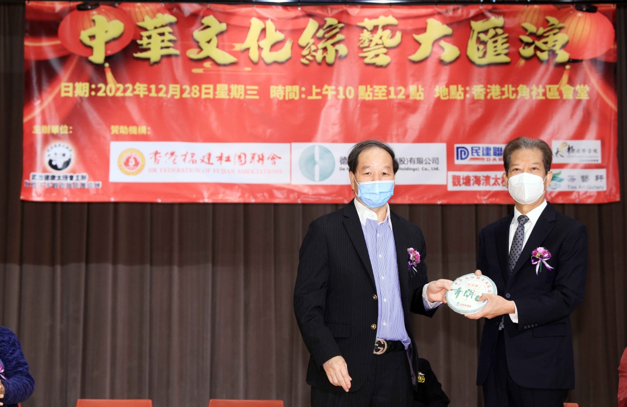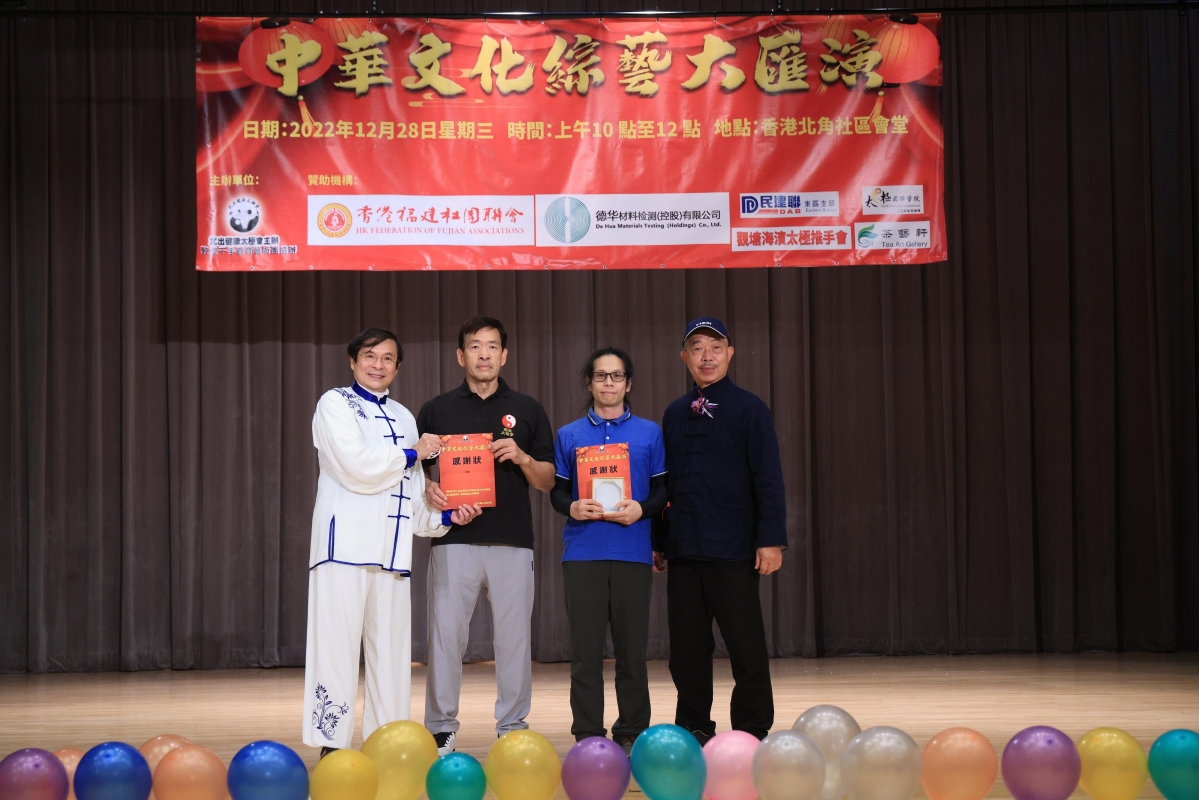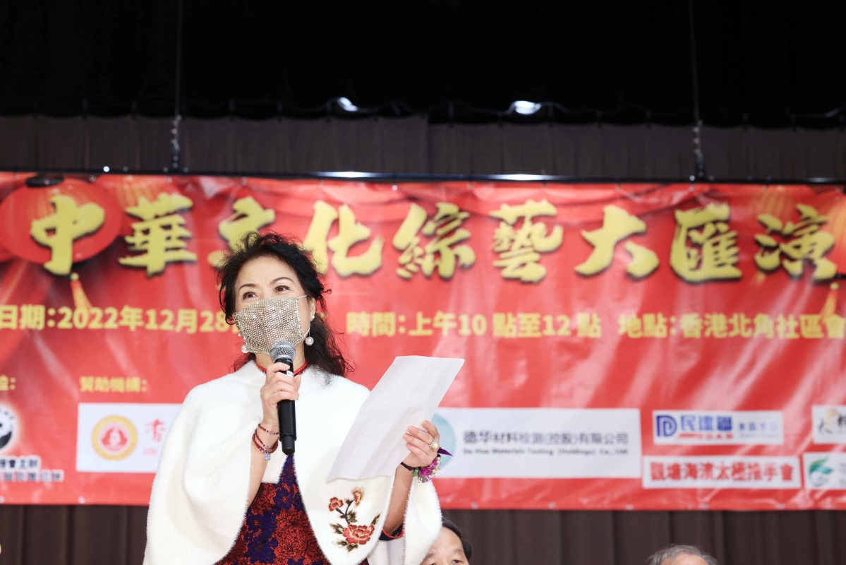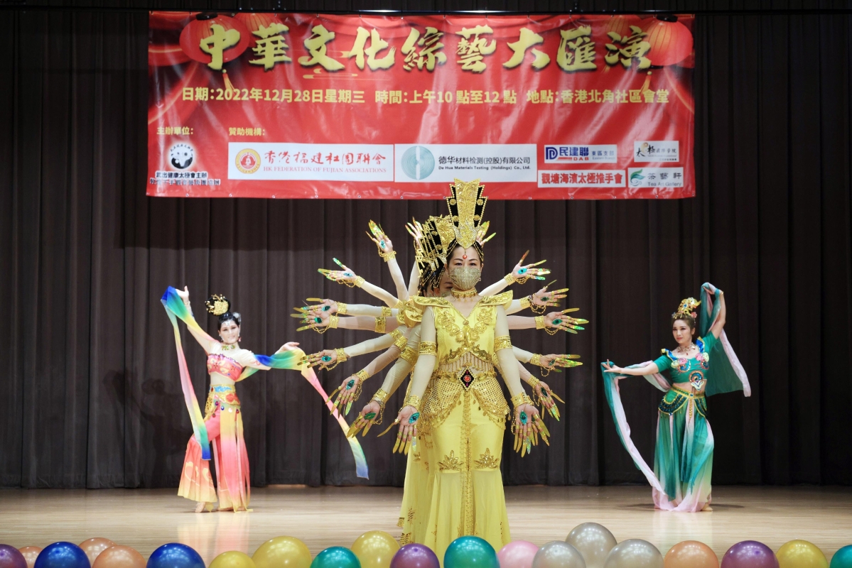 香港《中華文化綜藝大匯演》舉行香港新聞網12月28日電 為迎接2023年新年帶來新氣象,由香港武出健康太極會主辦、香港福建社團聯會、觀塘海濱太極推手會、太極國際學院、德華材料、香港茶藝軒以及敦煌千手觀音舞蹈藝術團等閩南籍社團支持參與的一台《中華文化綜藝大匯演》12月28日在北角社區會堂熱鬧舉行,吸引數百觀眾到場欣賞演出。 這場經過精心籌備的綜合節目豐富了區內娛樂文化生活,緩解民眾心情並發揮正能量。活動得到香港福建社團聯會及社會各界知名人士蒞臨主禮包括,前全國政協委員盧溫勝、前全國政協委員余燊教授、 太極國際學院主席林文輝太平紳士、千手觀音舞蹈團團長廖蘭香、香港茶藝軒劉正慶、香港美術研究會會長王子天、千手觀音藝術團榮譽會長吳永康、嘉福康體公司尤贊成、民建聯東區支部副主席林心廉、武出健康太極會副會長郭詠健、航天科技教育發展有限公司/拿督洪楚焺、觀塘海濱推手會何成、香港觀塘推手會施雄鵬師傅、香港中泰盛大投資集團董事長林梅香、香港生寶生物科技有限公司董事蔡燕珊小姐等蒞臨主禮。廖蘭香團長致辭時表示,非常感謝此次活動得到香港福建社團聯會、林廣兆先生的大力支持,“千手觀音舞蹈團”近年在大眾的支持下,努力傳播中華傳統文化,也受到社會各界的好評,我們將會再接再厲為弘揚中華文化努力。