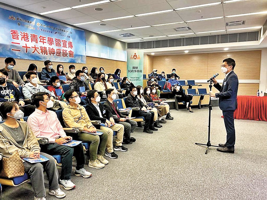 觀塘民政處舉辦“香港青年學習宣傳二十大精神座談會”。 圖源:文匯報 胡廣培表示,中共二十大是一次非常重要的大會,國家過往在不同領域取得驕人發展,人民生活質素日益提高。展望未來,國家會着重高質量發展。年輕人要把握時代機遇,腳踏實地,在社會發揮所長,為國家現代化、全面推進中華民族偉大復興而奮鬥。 觀塘民政專員林兆康在會上發言,勉勵年輕人要主動了解國家發展方向,裝備自己,為中華民族偉大復興作出貢獻。 他亦鼓勵青年閱讀特區政府最新發表的《青年發展藍圖》,就藍圖發表意見,讓政府能持續檢視及增潤當中內容,回應青年所需。 (完) 【編輯:王軼南】