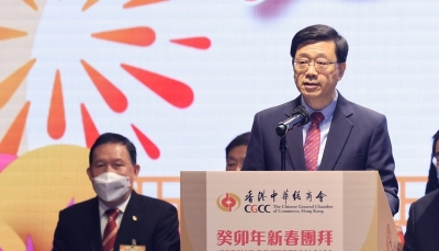 香港新聞網2月3日電 香港潮屬社團總會今日於灣仔會展中心舉行癸卯新春團拜。財政司司長陳茂波,中聯辦副主任何靖,律政司司長林定國,政務司副司長卓永興,中聯辦社聯部部長鍾吉昌、港島工作部部長薛惠君、新界工作部部長李薊貽,以及一眾政府官員,中聯辦領導,潮屬社團首長、嘉賓及會員,新聞界朋友,港九潮州公會中學、荃灣潮州公學、潮商學校及潮州會館中學等近300人歡聚一堂,同賀癸卯兔年新春,場面溫馨熱鬧。
