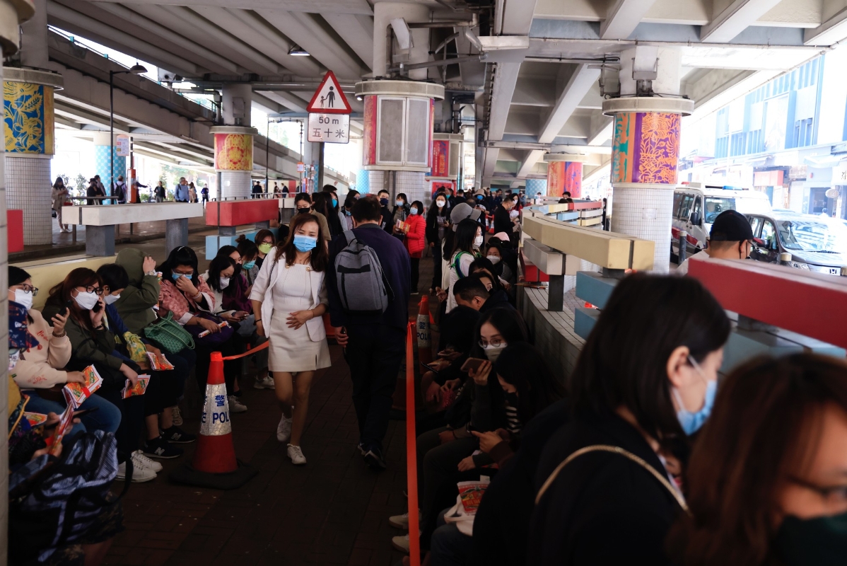 市民排隊“打小人”。圖源:香港中通社 香港島灣仔區的堅拿道天橋橋下,即鵝頸橋底是最著名的“打小人”地點。當日,各個攤位的營業者忙得熱火朝天,攤位上拍打聲不斷,並念念有詞,“打你個小人頭,打到你有氣無掟抖!”