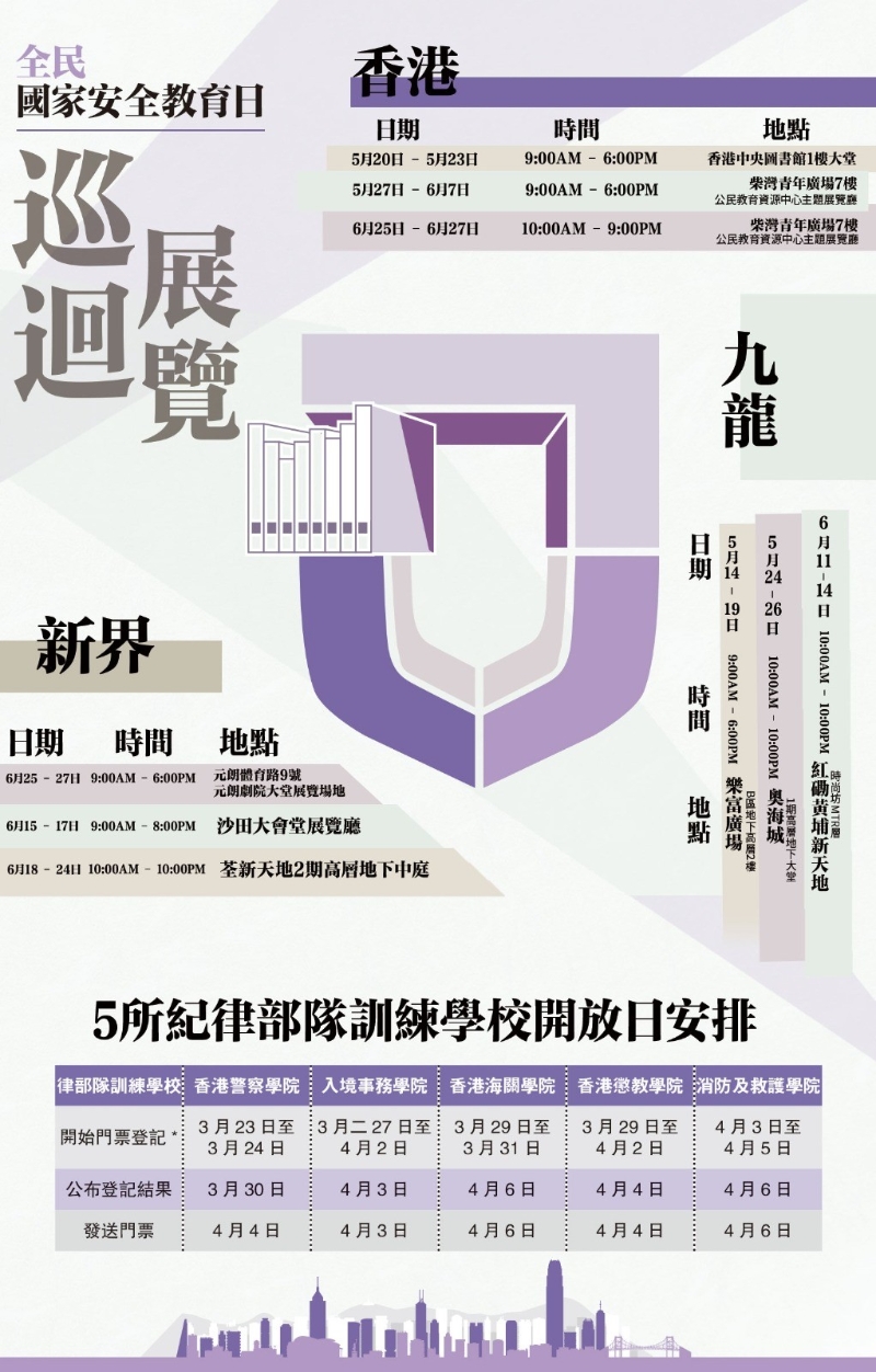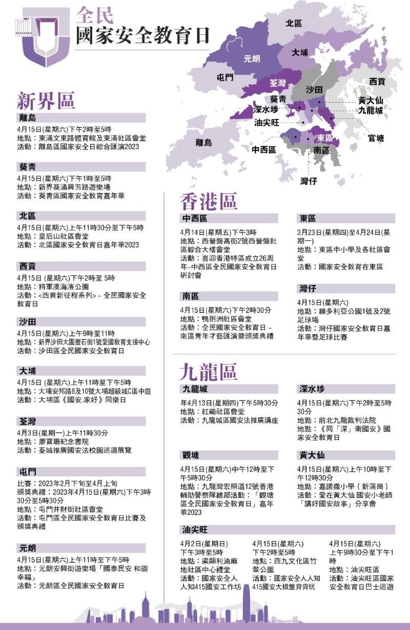 香港新聞網4月11日電 香港特區政府將在4月15日“全民國家安全教育日”舉辦一系列活動,讓市民了解國家安全對香港長期繁榮穩定的重要性。 李家超表示,今年活動的主題是“國家安全 穩定繁榮基石”。這是香港全面復常後迎來的首個“全民國家安全教育日”,所以會舉辦更全面、更實體、更多元的非線上活動,全方位提升和營造香港認識國家安全的氛圍。 李家超指出,國安教育應從小做起,特區政府會舉辦小學工作坊,並向全港小學派發6萬本國家安全繪本。“維護國家安全,人人有責。期望市民及社會各界支持和熱烈參與系列活動。” 今年4月15日“全民國家安全教育日”的活動將包括紀律部隊綜合升旗禮、紀律部隊開放日、紀律部隊國家安全盃頒獎、“全民國家安全教育日”開幕典禮、專題講座、學校工作坊、社區巡迴展覽等。同時全港18區也會舉行活動,共同響應“全民國家安全教育日”。 以下為活動詳情: