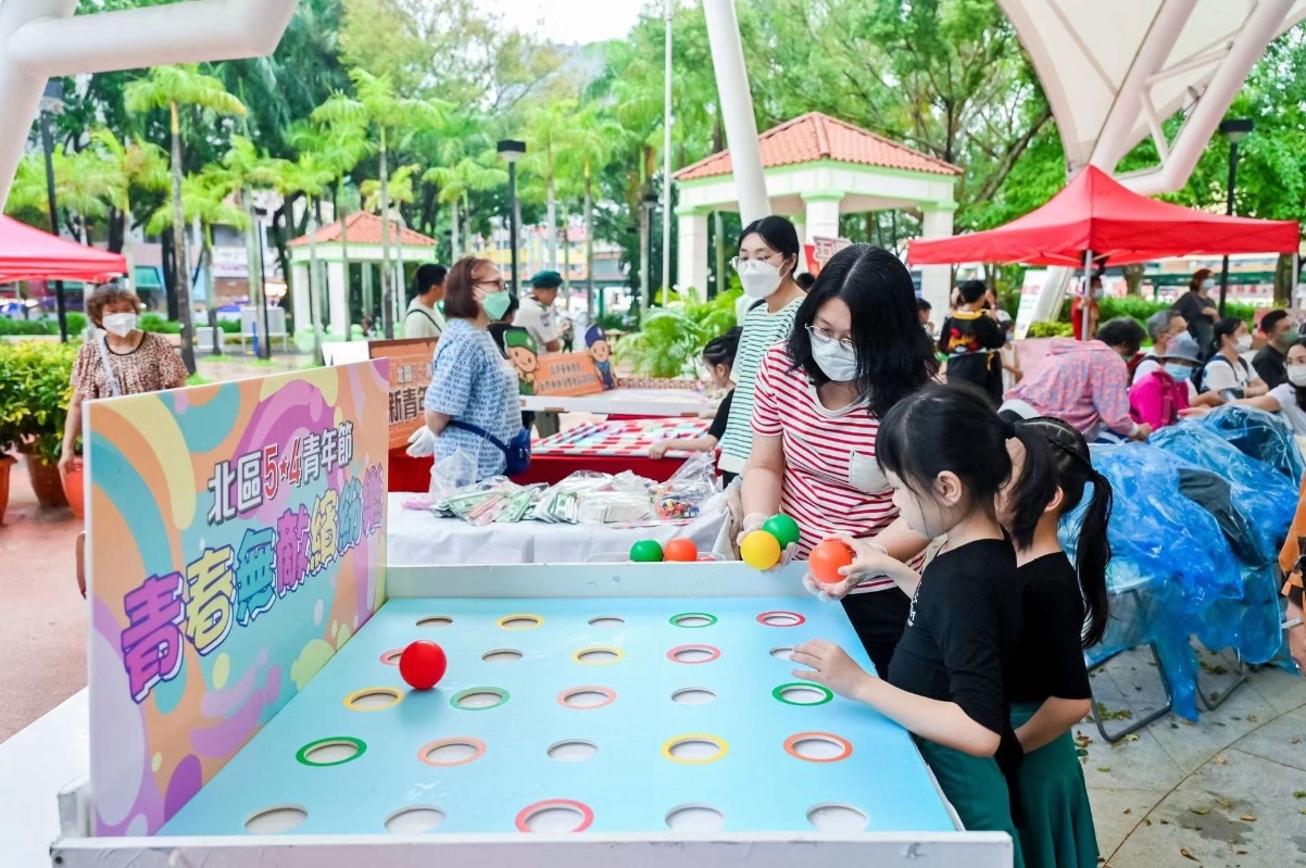 現場設有攤位遊戲活動。 北區優秀學生協會主席陳浚榮先生表示,今年才藝匯演包括青年歌唱、舞蹈、武術及魔術表演,也不乏攤位遊戲及五四歷史圖片展覽,豐富青年的文化生活,同時也為他們提供互相學習與交流的機會。