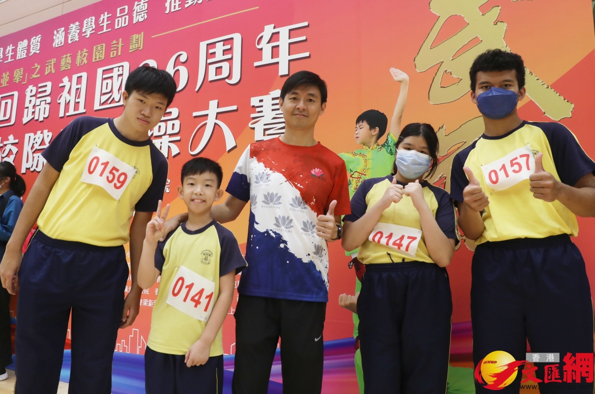 詹浩佳(中)、許詠詩(右二),圖源:香港文匯報 患有輕度智障、來自道慈佛社楊日霖紀念學校的展能組參賽者許詠詩表示,剛開始學習武藝操時,的確感覺有些難度,“架擋、踢腳等動作比較複雜,但過程間也覺得很有趣。”因此詠詩從未想過放棄,更是在每周約五次武藝訓練的刻苦努力下,詠詩進步神速。她覺得習武的這段日子裏,自己的氣質和體魄都有所提升,過程間也是加深了對中華文化的認識。 體育老師詹浩佳續指,同學們在學習武藝操時,會接觸不少中國傳統禮儀,例如抱拳禮等,有助培養學生品德禮貌。以往國民教育大多數都側重於知識層面,隨着武藝計劃的推廣,於體育課融入中國文化元素,令國民教育動靜結合,比以往更加完備,“同學在學習武藝後,對於國家的歸屬感亦有所提升!” 香海正覺蓮社佛教普光學校的劉俊鴻老師表示,學習武藝操有助訓練同學們的紀律性、方向性和節奏性,也是有助提升學生的身心素質,以及培養他們對國家認知和歸屬感。學校未來會進一步優化武藝文化的教學,以更好地引導學生吸收和了解中華傳統的德藝文化。 (完) 【編輯:王軼南】