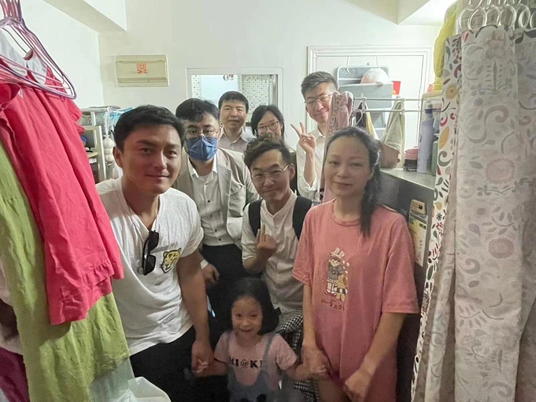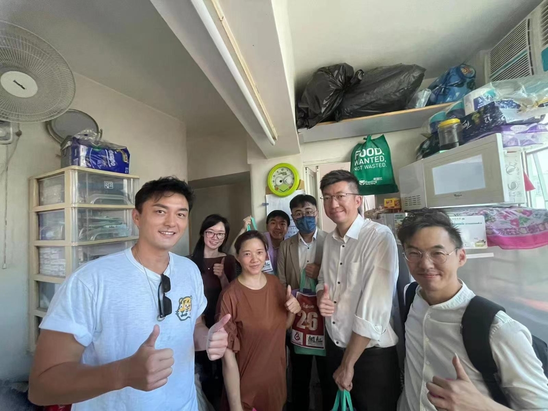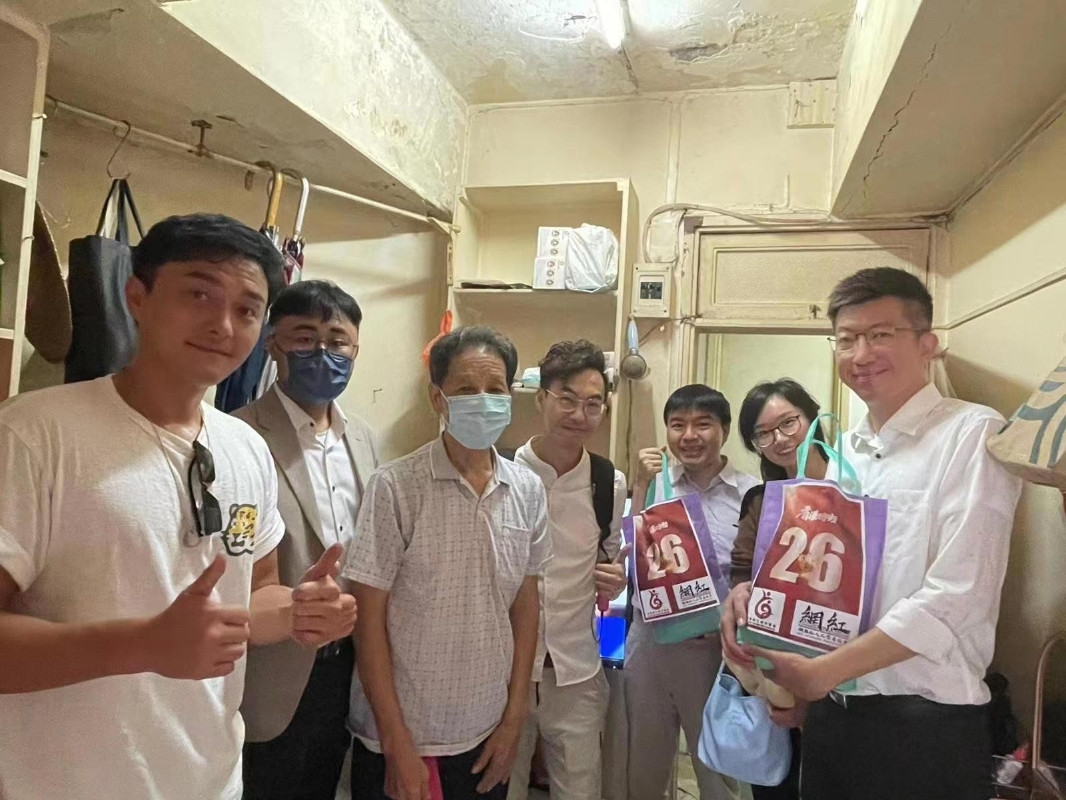 KOL和藝人給基層民眾送福袋。圖源:受訪者提供 召集人高松傑、曾榮輝、李凱湖、石房有、林伯強,郭德英(空姐牛肉飯)等一班KOL,並邀請了九龍城助理民政事務專員陳子豐、九龍城區居民聯會林博、藝人楊明,於27及28日到訪土瓜灣及順利順安邨,上門向劏房及公屋的單親基層家庭、困難老人送上關愛包和慰問金,關心他們所需,向他們送上慶祝香港回歸嘅問侯。