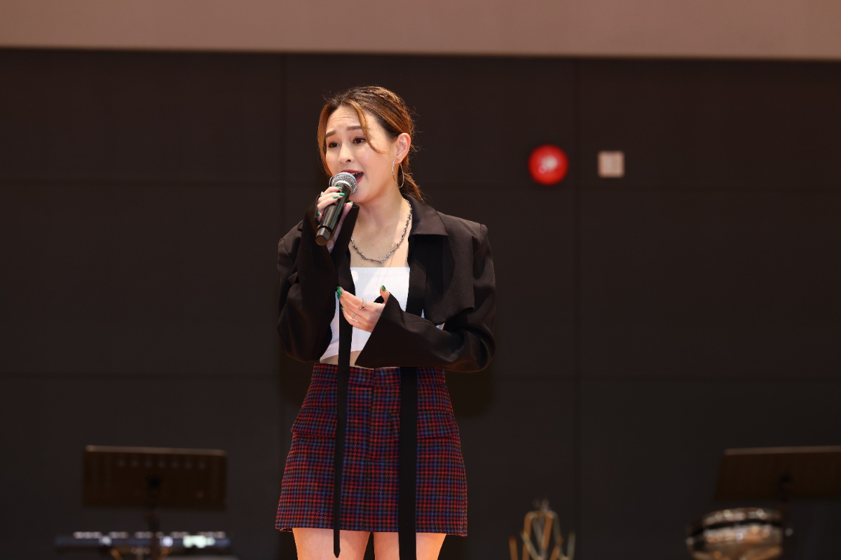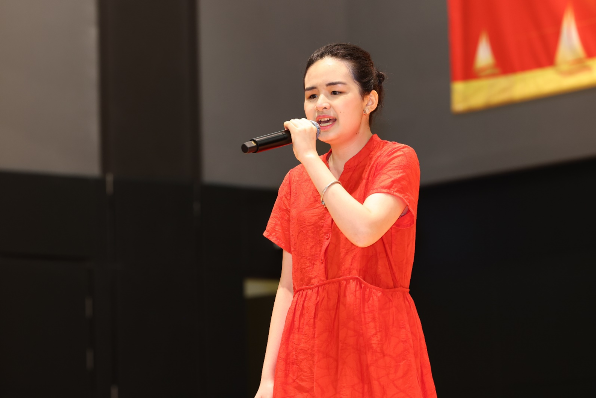 視障女高音蕭凱恩在台上獻唱《我和我的祖國》。
