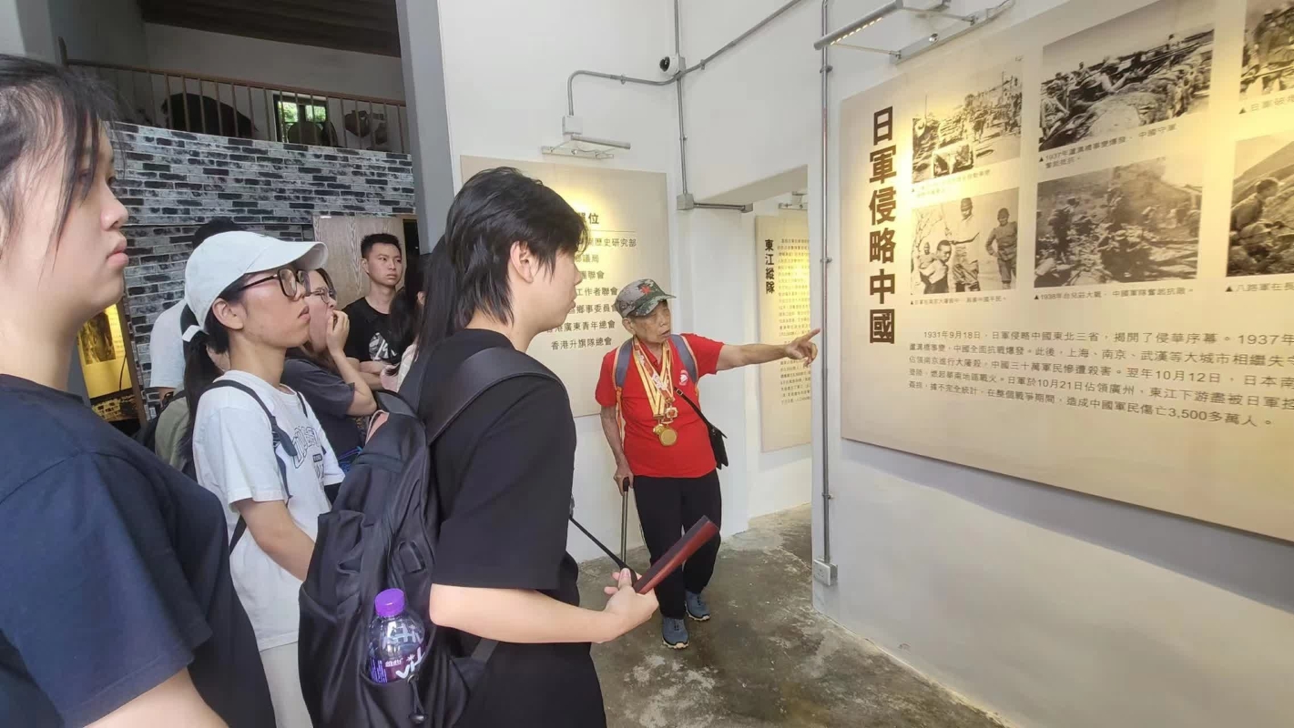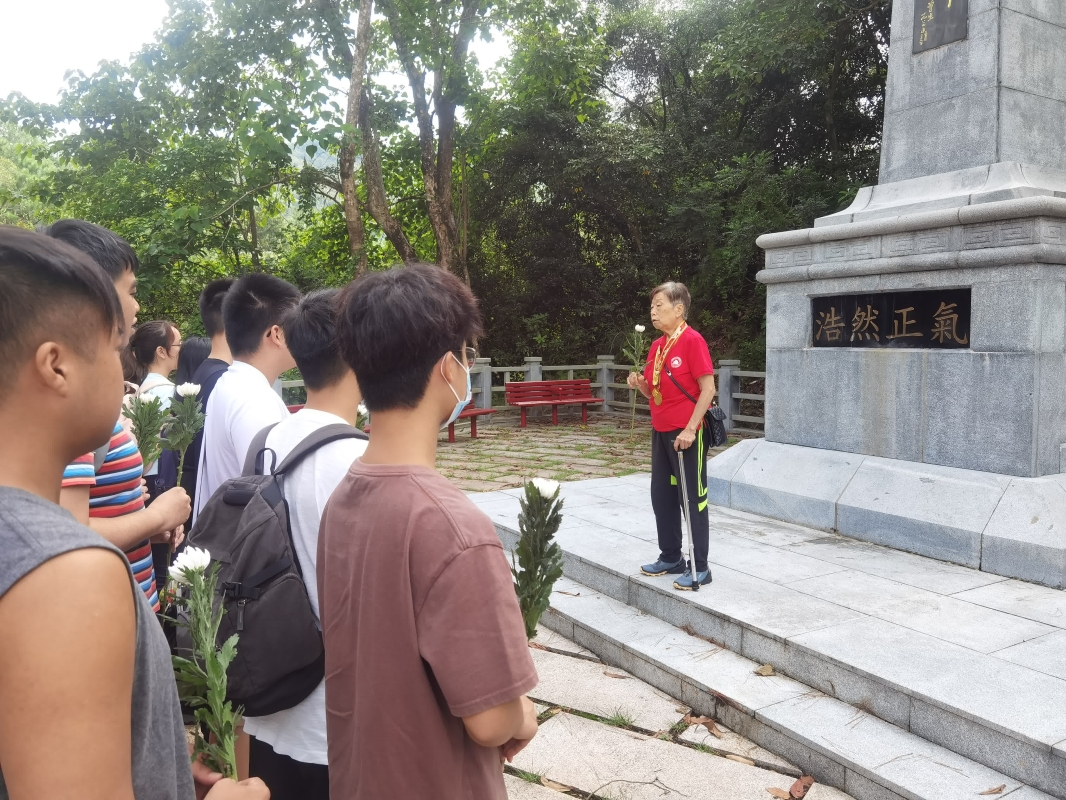 師生赴香港新界沙頭角烏蛟騰村抗日英烈紀念碑學習參觀。受訪者供圖 在烏蛟騰抗日英烈紀念碑前,抗日老兵林珍女士向青年們講述了烏蛟騰村的抗戰歷史,中國共產黨與港人浴血奮戰的事跡,引導同學追憶先烈,厚植家國情懷。祭奠儀式上,香港學生敬獻花圈,集體默哀,彷彿走進70多年前那段風雲激蕩的崢嶸歲月。 同學們在沙頭角抗日紀念館中,通過文物、文字、影片等重溫香港抗日的點點滴滴,鬧市中的聯絡站、八路軍駐香港辦事處、秘密大營救等等,彷彿感受到當時香港人民同氣連枝團結抗戰心情。
