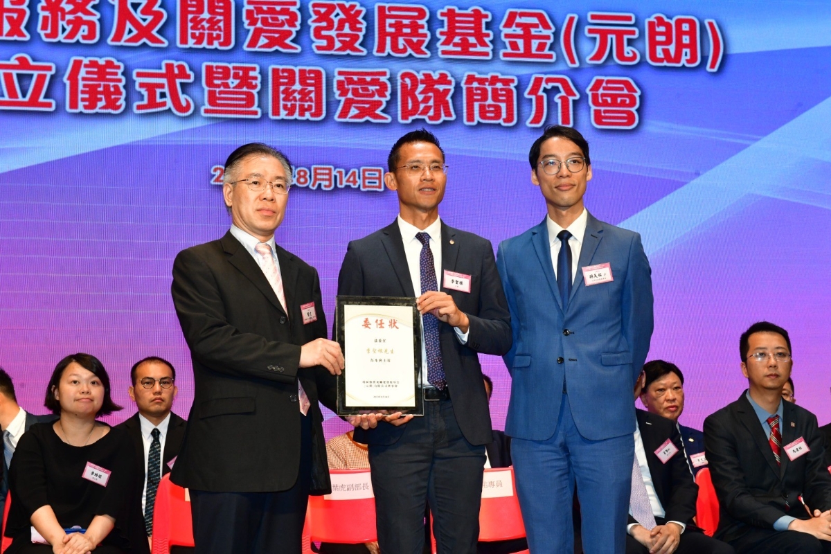 主禮嘉賓頒發主席委任狀予李聖根。圖源:香港商報 主席李聖根表示,基金會成立的目的就是為了元朗區關愛隊的發展提供助力,在政府資源之外,為關愛隊注入更多社會支持。基金會定必全力支持元朗區關愛隊的成立及運作,並配合元朗民政事務處,令關愛隊的運作更加暢順。基金會工作方向包括:全力支援特區政府完善地區治理、透過關愛隊的平台,加強地區服務、以及幫扶區內青少年發展成長,讓區內市民都感受到更多的幸福感。截至目前為止,元朗地區服務及關愛發展基金已經籌得港幣 1200 萬元。
