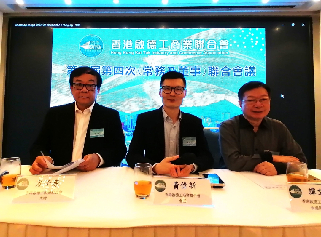 香港啟德工商業聯合會會長黃偉新(中)、主席方子康(左)、永遠榮譽會長譚文智主持會議