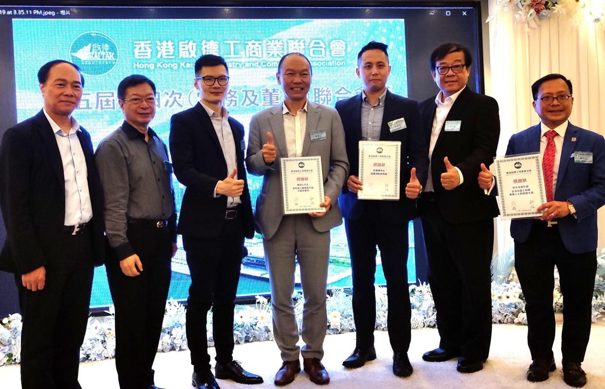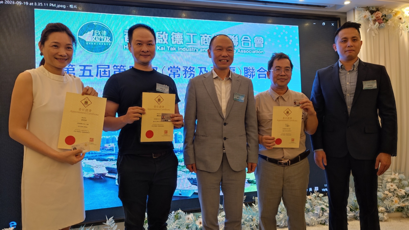 消防處九龍中區指揮官陳富山(中)、啟德消防局長梁煒烽(右)向啟德工商聯會長黃偉新(右二)、主席方子康(左)、永遠榮譽會長譚文智(左二)頒發消防安全大使證書
