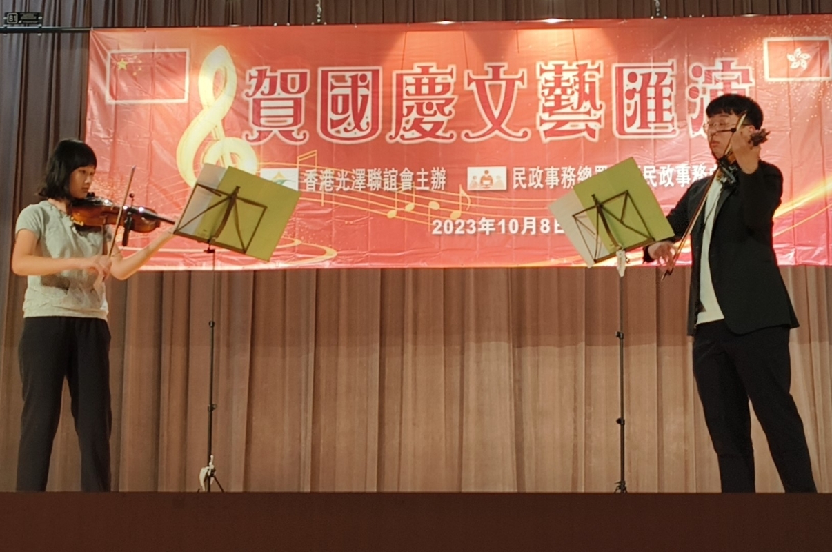香港光澤聯誼會舉辦“賀國慶文藝匯演” 儀式結束之後,本次匯演繼續了精彩的下半場,匯演節目豐富,獨唱丶合唱歌聲嘹亮,餘音繞樑;鋼琴丶小提琴丶銅管樂輪流上場,引人入勝;現場既有舞蹈丶粵劇表演,又有太極拳丶長拳丶八卦掌演練,氣氛熱烈,掌聲陣陣,場上場下歡聲笑語,其樂融融。是次匯演共有300餘名鄉親街坊共同參與觀看了表演。 【編輯:曹文毓】