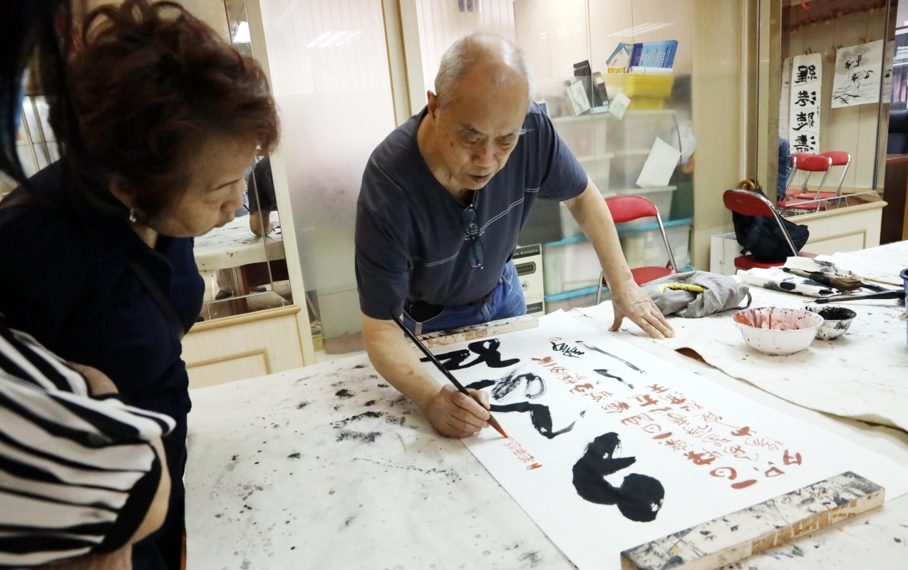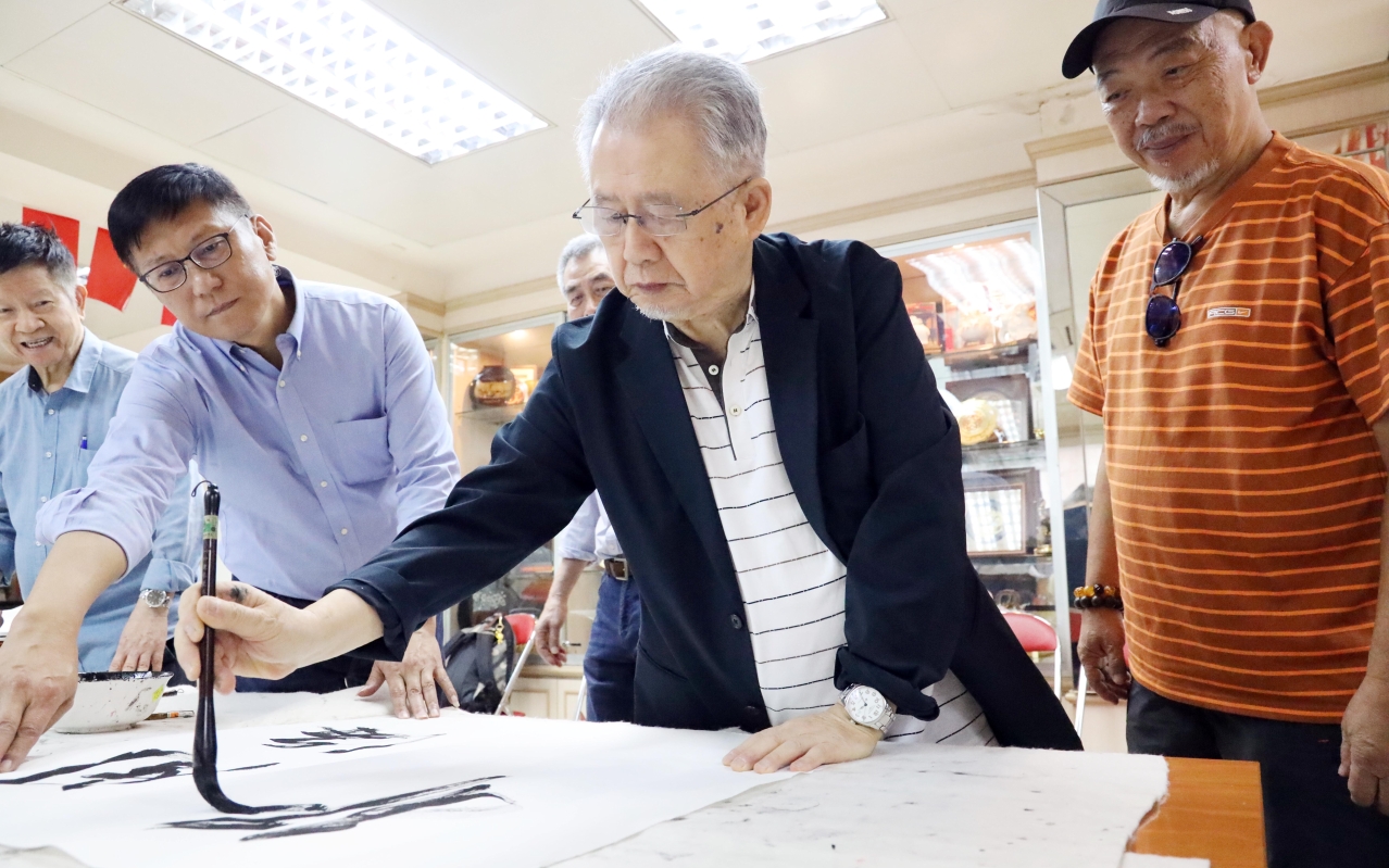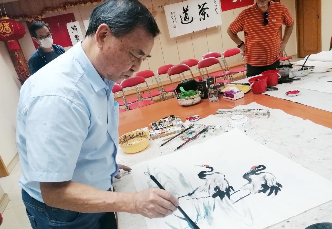 香港福建書畫研究會理事長陳方遠(右)在作畫。