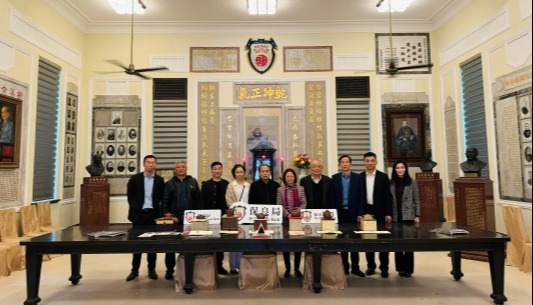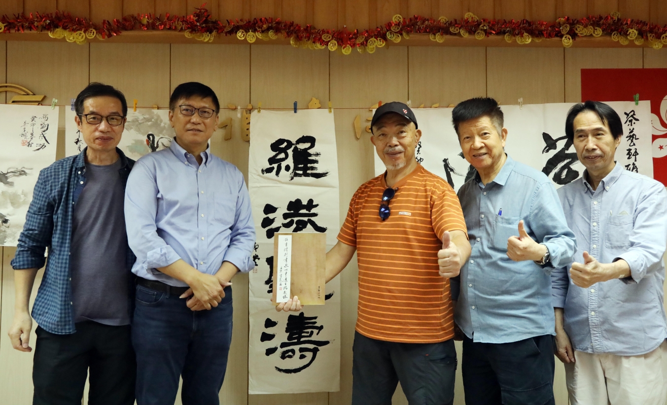 中國書法家協會會員施育煌(左二)贈送作品集給予香港太極推手名家施雄鵬師傅(右三)。
