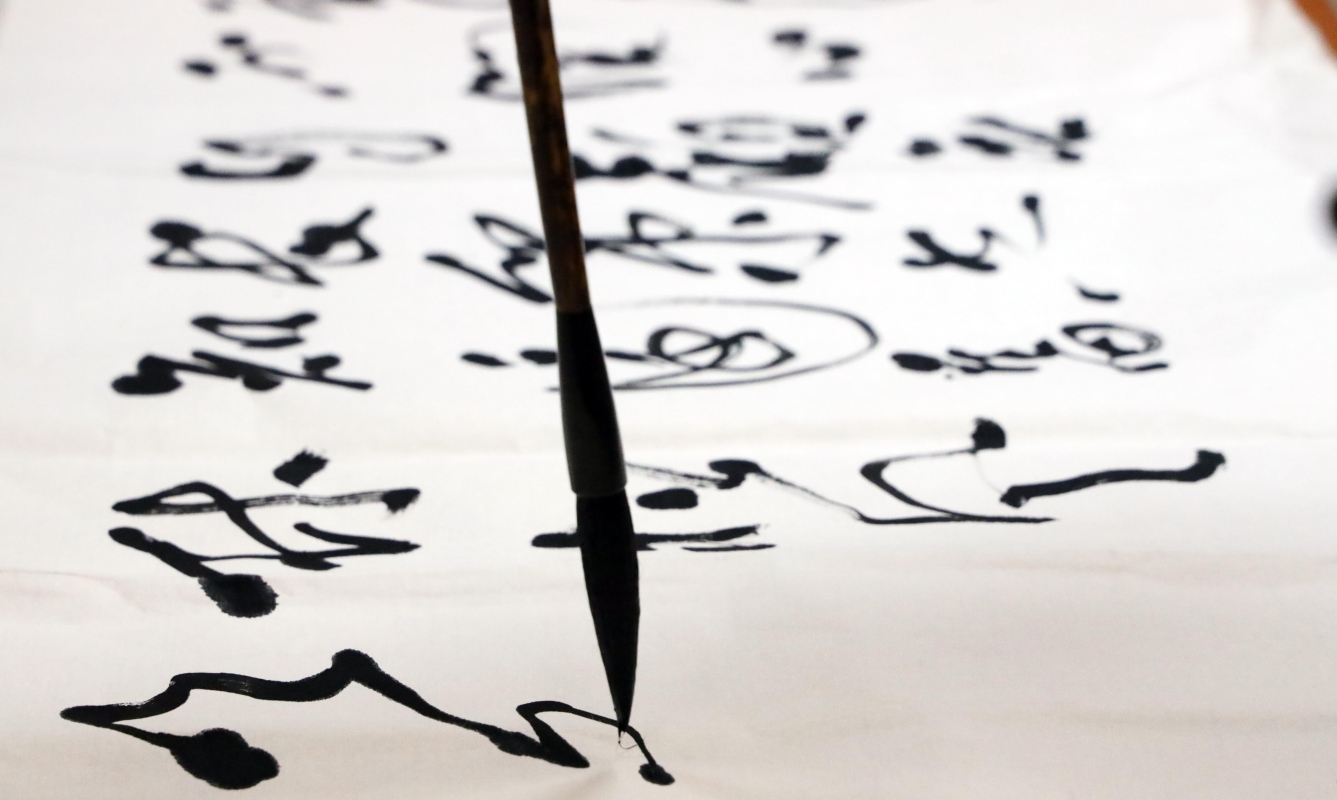 中國書法家協會會員、中國書協香港分會理事楊煌(左二)《醉》,該作品用沉香粉和茅台酒加入墨水之中,潑墨疾書成作品,別具一格。