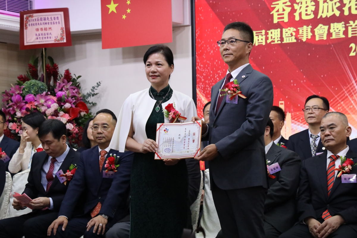 香港中聯辦新界工作部副部長李功勛(右)向旅港角美同鄉會創會會長林素花女士頒發證書