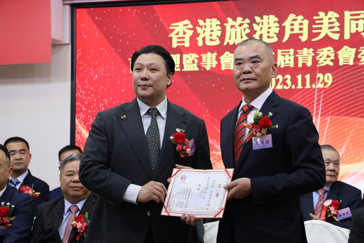 香港福建社團聯會主席施清流(右)向旅港角美同鄉會首屆會長莊毅穎頒發證書