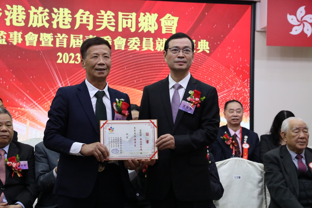 漳州市委統戰部常務副部長王金獅(右)向旅港角美同鄉會理事長林永源頒發證書