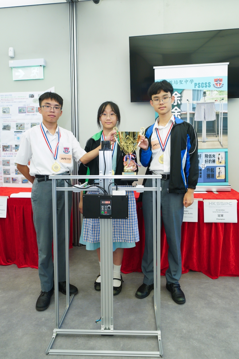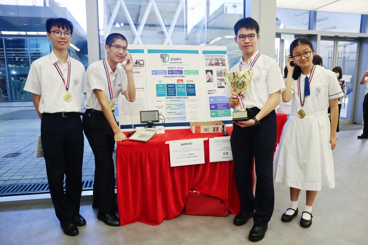 是次決賽由香港城市大學副校長(社區聯繫及協作)陳志豪教授,以及香港中文大學工程學院助理院⾧(學生事務)劉達銘教授分別擔任高中組及初中組的首席評審,帶領7位來自主辦機構、學界和業界代表組成專業評審團。一眾決賽隊伍需向評審團介紹其科學發明品或研究成果,展示其創新能力及科研精神,並透過解難、溝通及團隊合作等重要技能,應對未來社會的挑戰。 20 支決賽隊伍的創科能力均獲得評審團高度肯定。在嚴格甄選下,4 支冠軍隊伍脫穎而出,勇奪學界最高殊榮。初中組(發明品)冠軍由天主教培聖中學的隊伍以『“除除”善友』奪得,作品利用簡單機械裝置,幫助行動不便的長者能夠自行穿脫褲子,減少長者受傷的機會,同時守護他們的自尊心與尊嚴;而協恩中學隊伍則以『“酪”在其裝』贏得初中組(研究項目)冠軍,團隊透過實驗研究出酪梨種子能夠成為脫氧劑,同時亦可製成一個天然包裝膜,為食品保鮮提供一個更天然的選擇。 高中組(發明品)冠軍來自迦密主恩中學團隊發明的『“耆”逢敵“守”』,有見長者容易遇上電話騙案,發明裝置可實時把電話聲音轉換成文字,並透過內置關鍵字進行校對,如過程中發現潛在騙案,裝置將發出圖像警報,同時亦會向長者家人發送Whatsapp及電子郵件提示,以防止長者受騙。伊利沙伯中學舊生會中學的隊伍發現大麥蟲能攝食塑膠,於是透過研究分析大麥蟲對於不同塑膠的消化能力,以尋求生物降解塑膠的可能性,最終憑“蟲仔的膠盛宴”成為高中組(研究項目)冠軍。