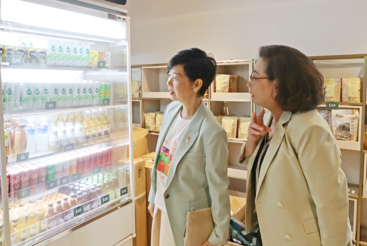 房屋局局長何永賢(左)與齊惜福發起人及過渡性房屋項目管理委員會主席梁唐青儀參觀“荃福居”的便利店。