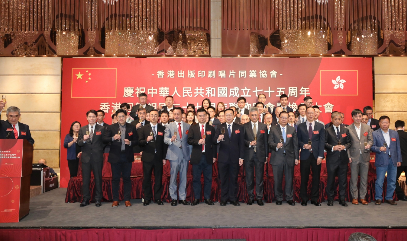 香港出版印刷唱片同業協會舉辦國慶75周年、香港回歸祖國27周年聯歡晚會香港新聞網9月16日電 由香港出版印刷唱片同業協會舉辦的慶祝中華人民共和國成立七十五周年、香港回歸祖國二十七周年聯歡晚會暨換屆大會在香港舉行。逾 380位香港各界人士齊聚一堂,共同慶祝中華人民共和國成立七十五周年暨香港回歸祖國二十七周年,並見證協會新一屆組織架構的成立。