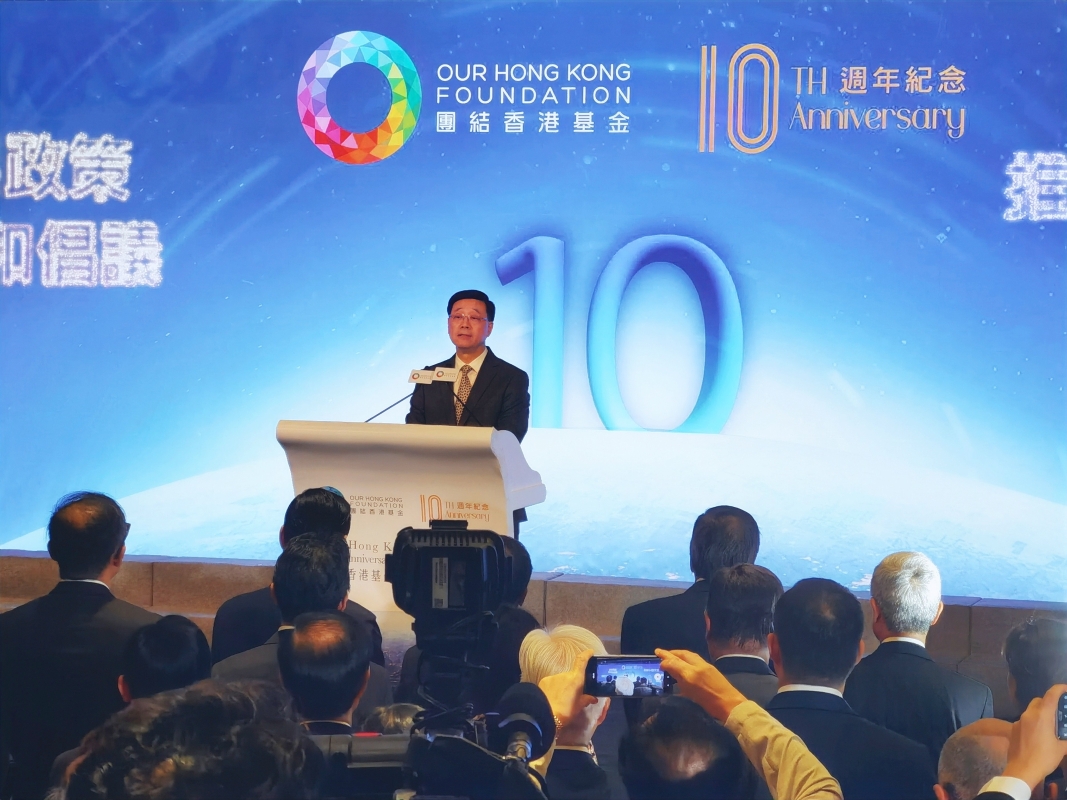 香港新聞網9月25日電(記者 譚暢)團結香港基金今年迎來成立十周年。25日,團結香港基金舉行慶祝酒會,港區全國人大代表、政協委員、立法會議員、各界別人士、外國領事、基金會理事參事及惠澤機構代表等約900人出席。 基金會主席陳智思出席並宣讀中央港澳工作辦公室主任、國務院港澳事務辦公室主任夏寶龍發出的祝賀信。陳智思引述夏寶龍主任賀信內容指,團結香港基金成立十年來,堅定擁護“一國兩制”方針,團結社會各界開展政策研究、弘揚中華文化、編纂香港地方志等工作,形成了一大批研究成果,為保持香港繁榮穩定、提升香港競爭力作出了積極貢獻。 陳智思表示,團結香港基金已經成為全球頂尖1%的智庫。未來,團結香港基金會更好地利用香港獨特的“一國兩制”優勢和作為國際城市的地位,加強與國際社會的聯繫,擴大對國家及香港的敘述,並推動科學、技術與創新的議程,團結社會,爭取更廣泛的支持。