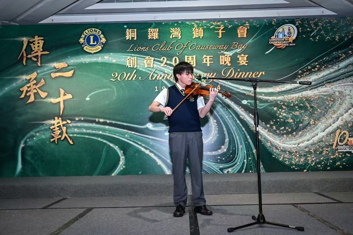 銅鑼灣少獅會醒獅隊現場表演助興 整個晚宴貫徹“傳承·二十載”的主題,除了開幕的少獅學校醒獅表演,晚宴中間更有獅子會蔣翠瓊中學石景㬢同學的小提琴表演以及張銘恆同學的花式跳繩表演。LEO-LIONS(由青年獅子會會員成為獅子會會員)更是紛紛相約上台拍照留念。來自獅子會的主禮嘉賓沈顏總監(第一位從青年獅子會會員成長為獅子會303區總監的獅友)、文錦歡前國際理事(創辦“港澳青獅基金”主席)、銅鑼灣獅子會創會總監楊偉誠博士,BBS,MH,JP、銅鑼灣獅子會創會指導冼姵璇前總監等都對銅鑼灣獅子會的過往表現和成績給予高度評價。主禮嘉賓陳百里副局長也以新一份《施政報告》中的其中三個範疇“1、降低烈酒稅吸引高端餐飲消費;2、對中小企業的政策扶持;3、大力發展銀髮旅遊經濟”作為寄語,鼓勵銅鑼灣獅子會以及來賓們對香港未來經濟發展充滿信心。