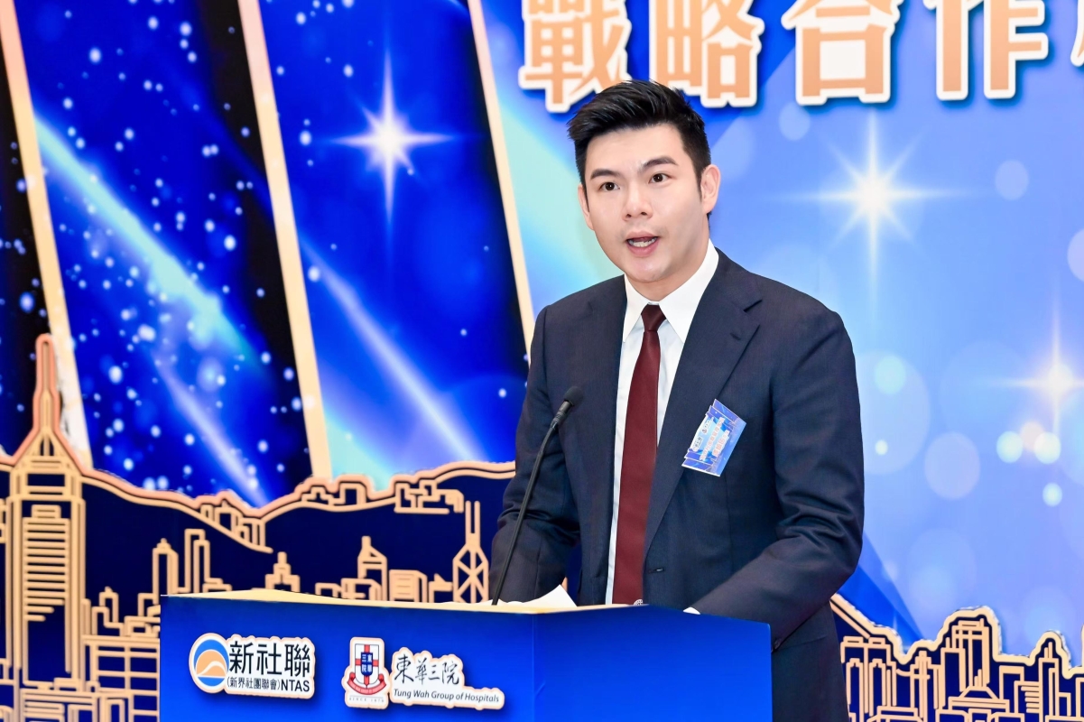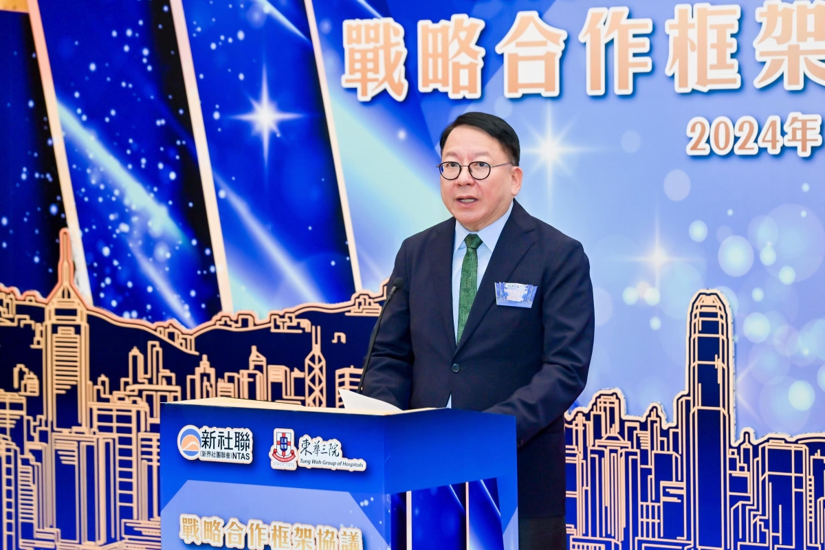 新界社團聯會理事長譚鎮國致辭 譚鎮國表示,作為地區基層社團表列團體、新界地區的龍頭社團,新界社團聯會一直扎根社區、服務社區,目前已經發展至有378個屬會,超過30萬會員,擁有強大而廣泛的社區網絡,是政府在地區層面提供後勤支援的重要夥伴。東華三院和新界社團聯會基於共同的理念與目標,簽訂戰略合作框架協議,希望可以優勢互補,共同滿足地區居民的多元化需要,有效協助特區政府,惠民紓困,同時希望可鼓勵更多不同界別的團體和朋友一起攜手協作,在更廣泛的層面服務好市民。