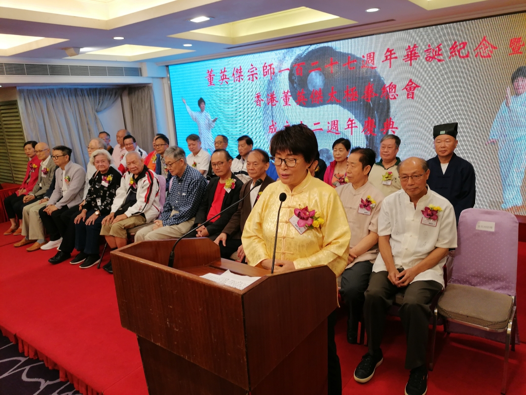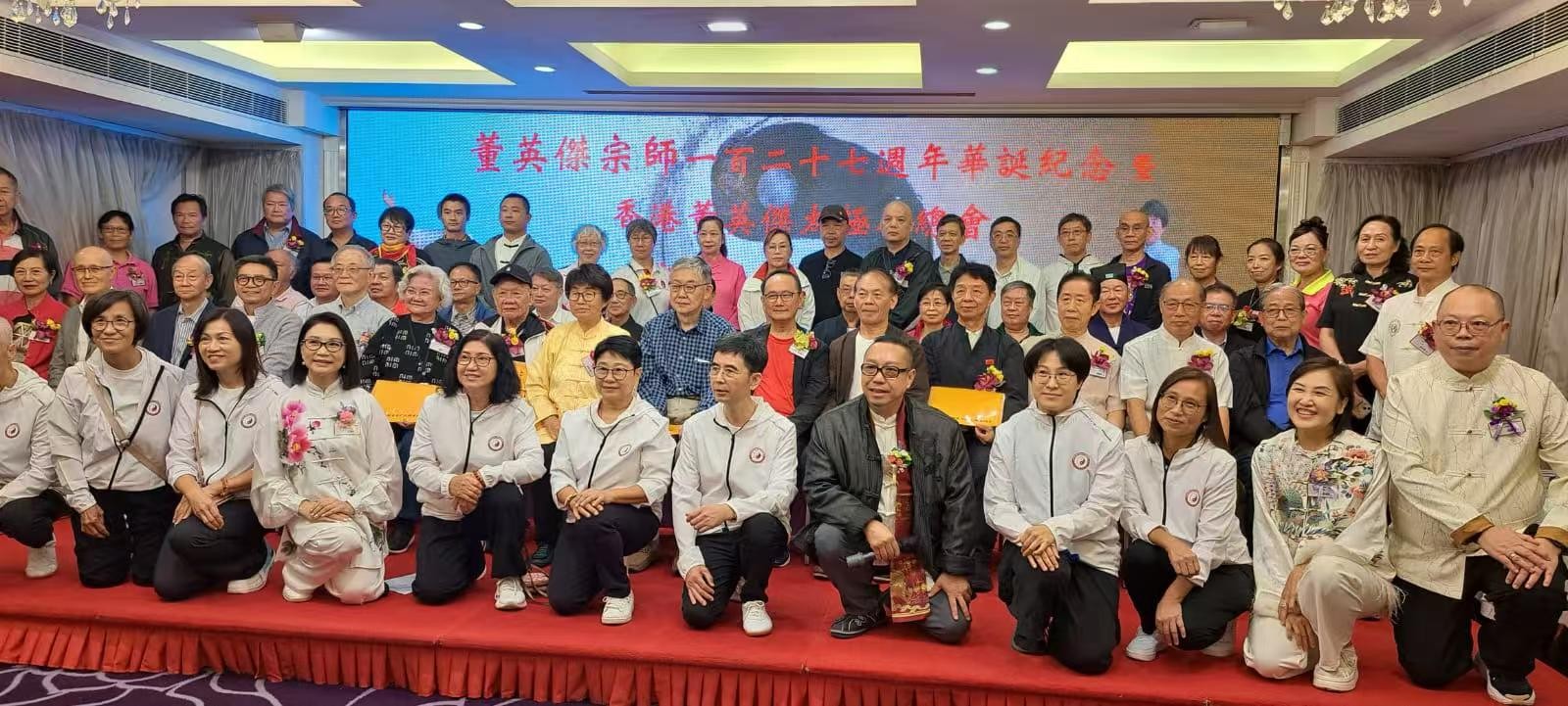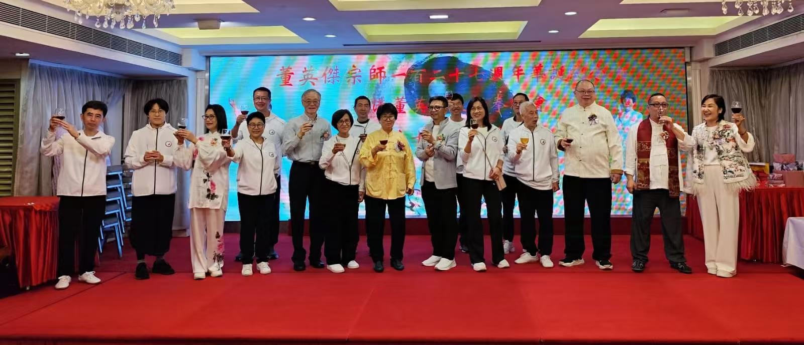 香港新聞網11月12日電 “香港董英傑太極拳總會”11月9日晚在九龍旺角倫敦酒樓舉行“董英傑宗師一百二十七周年華誕紀念暨香港董英傑太極拳總會成立20周年慶典”,董鄭曉芬師傅收徒儀式同場舉行,席間設武術表演,多名香港各門派武術師傅傾力演出,一派歡樂景象。 香港“董英傑太極拳總會”由董英傑先生孫媳董鄭小芬創立,旨在將中華武術精粹太極拳傳播發揚光大。 董鄭小芬70年代初隨家翁董俊嶺及夫婿貴辰師學習董家楊式太極拳。 90年代在香港教拳至今近30年,桃李滿天下。 歷年來,董鄭小芬師傅教授過的學生愈千人,遍布世界各地和港澳地區,參與各種武術比賽和匯演,均受到好評。