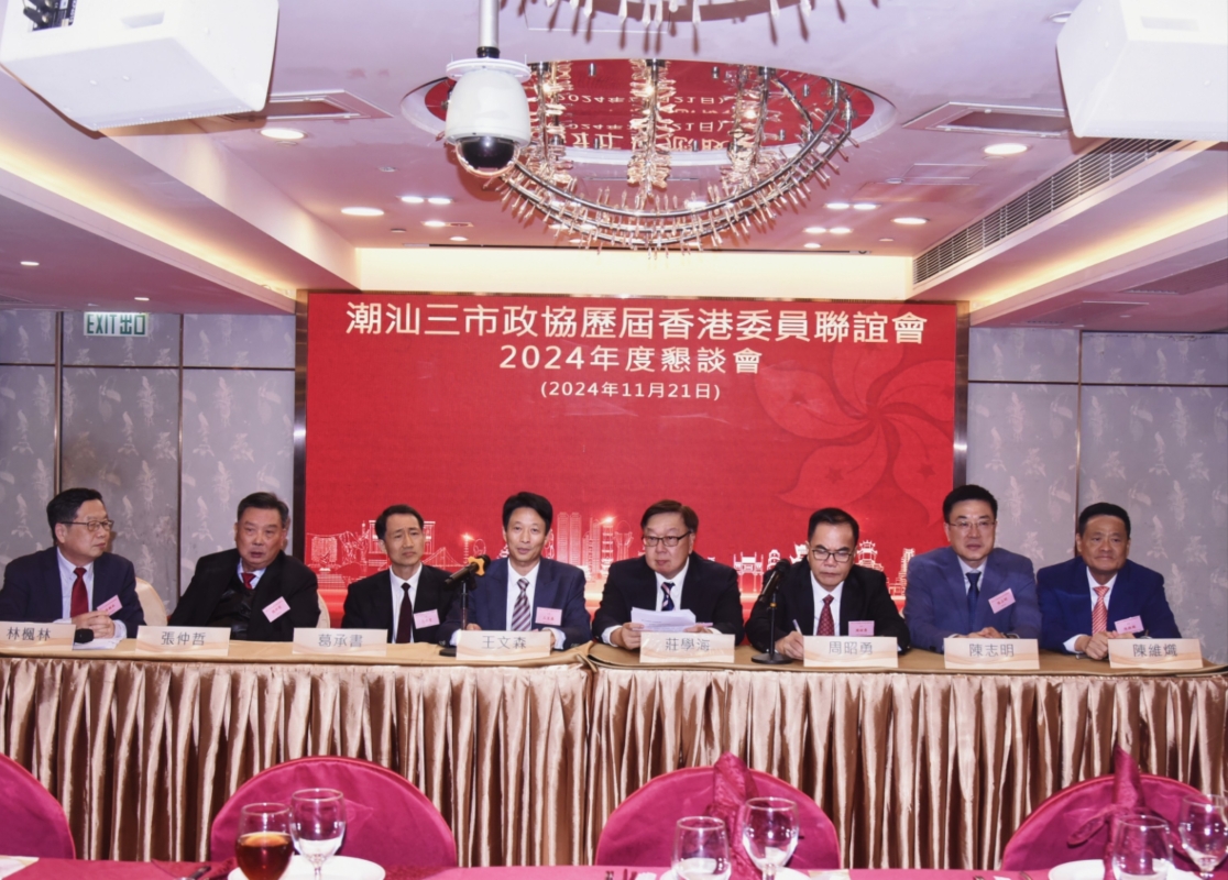 潮汕三市政協歷屆香港委員聯誼會舉行懇談會香港新聞網11月23日電 11月21日,潮汕三市政協歷屆香港委員聯誼會2024年懇談會在香港舉行。潮汕三市政協歷屆香港委員聯誼會輪值會長莊學海,聯席會長陳志明,張仲哲,廣東省潮州市政協主席王漢森,汕頭市政協副主席周昭勇,揭陽市政協主席葛承書,潮州市委常委、統戰部部長莊宋太,揭陽市委常委、統戰部部長姚麗璇等,以及港澳委員及嘉賓約130人歡聚一堂,暢敘鄉情,交流情況,共商潮汕港澳三地發展大計。港區全國政協常委高永文、港區全國政協委員李偉斌、劉智鵬、胡劍江、高佩璇。澳區廣東省政協委員劉智龍,中聯辦港島工作部鄭斌處長、聯誼會前會長黃書銳,潮汕三市政協澳門委員聯誼會陳海欽、陳維熾及陳旭偉等出席會議,該會秘書長林楓林主持懇談會。