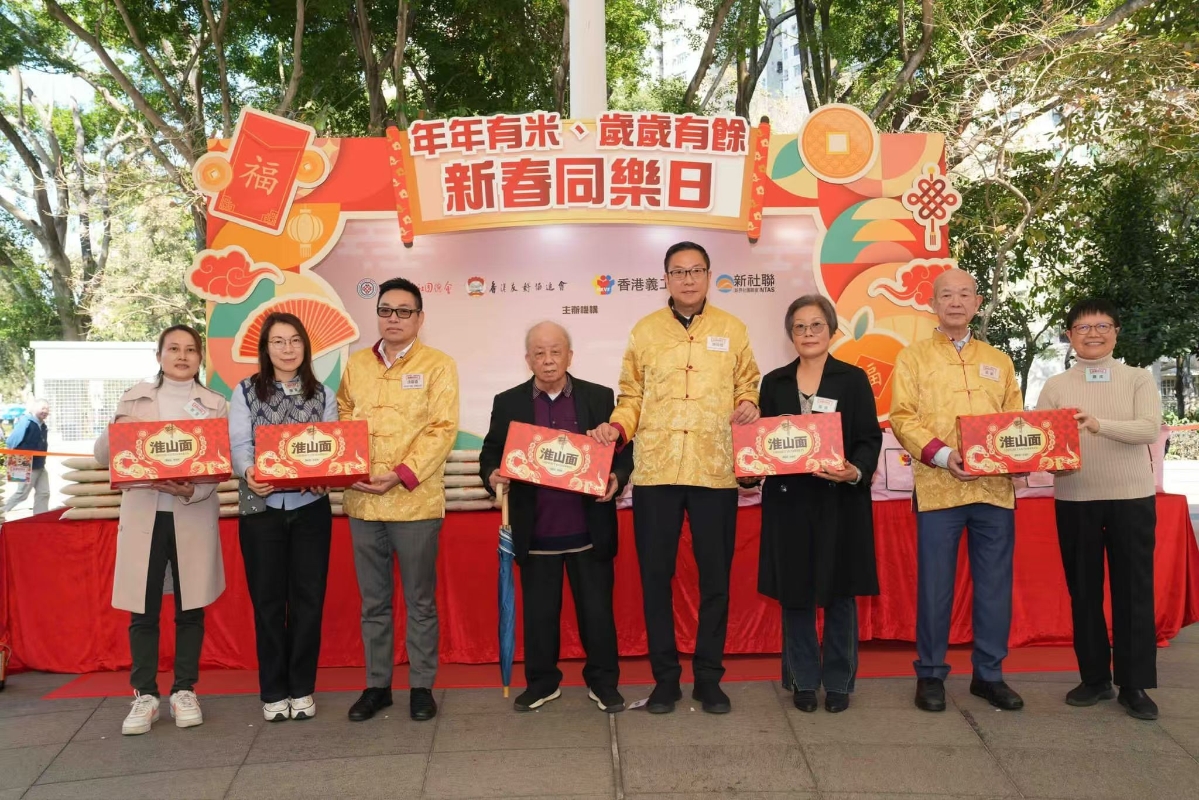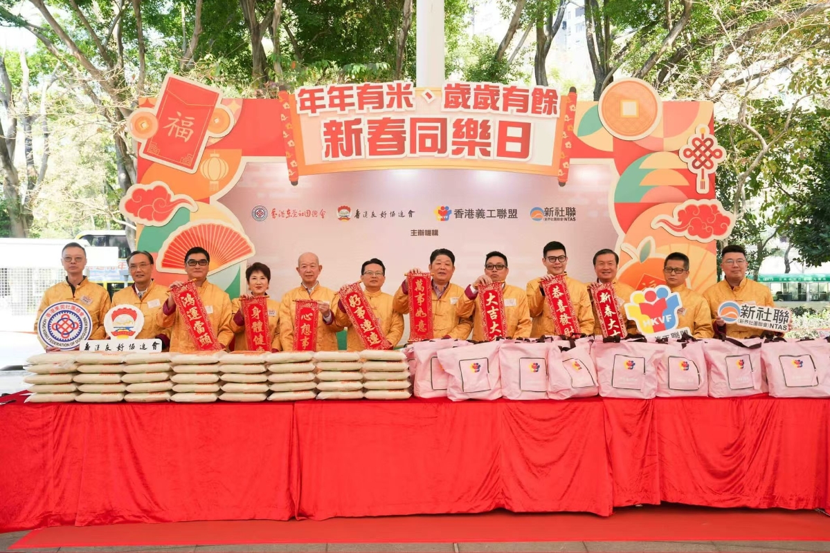 香港新聞網1月20日電 1月19日,香港義工聯盟、香港友好協進會、新界社團聯會聯同香港東莞社團總會在上水,合辦“年年有米、歲歲有餘”新春同樂日,為新界北區市民派贈新春福袋和米,現場還設有寫揮春攤位和新年飾品製作工作坊,吸引逾千人出席,開啟新春的熱鬧氣氛。