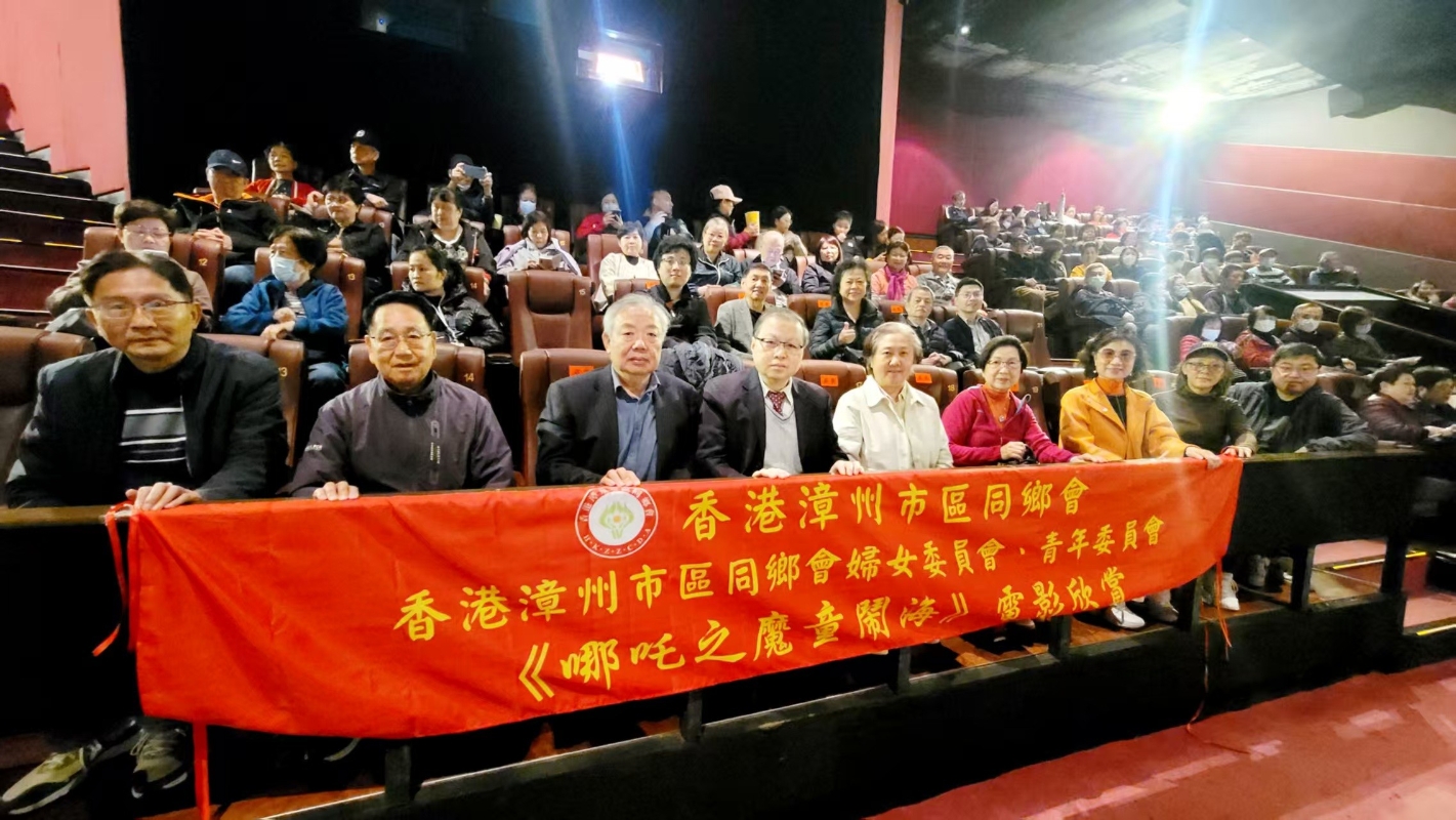香港新聞網3月18日電 香港漳州市區同鄉會及婦女委員會、青年委員會於3月17日晚上在銅鑼灣影藝戲院包場,舉行電影《哪吒之魔童鬧海》觀賞會。參加電影觀賞活動的有香港漳州市區同鄉會會長林紹奮、監事長莊子傑、副會長林素珍、陳乘杉、吳妙琴、林登倫,名譽會長貝志堅、秘書長林素英、常務副秘書長張海雄、副秘書長莊泌如及多位理監事和會員鄉親。還有香港僑界社團聯會主席王錦彪、副會長王德聖、香港許氏宗親會理事長許振志、參加抗美援朝的92歲志願軍的老英雄何敦夫等本港各界友好人士。274個座位座無虛席,大家全神貫注地欣賞代表中國電影界最高水準的動畫電影,觀摩中國動畫電影技術的進步,欣賞電影中千變萬化的藝術和特效,感受哪吒的奮勇敢拼的精神。截至3月15日,《哪吒之魔童鬧海》全球票房已達150億元,超越《星球大戰:原力覺醒》,位列全球影史票房榜第五位。