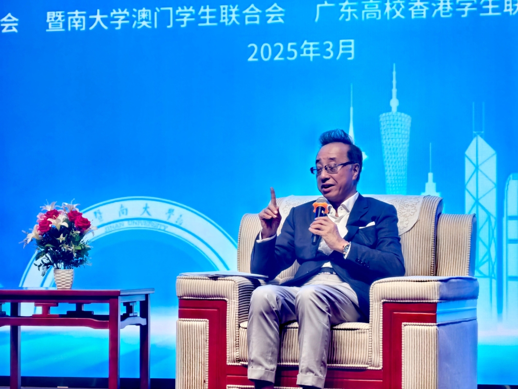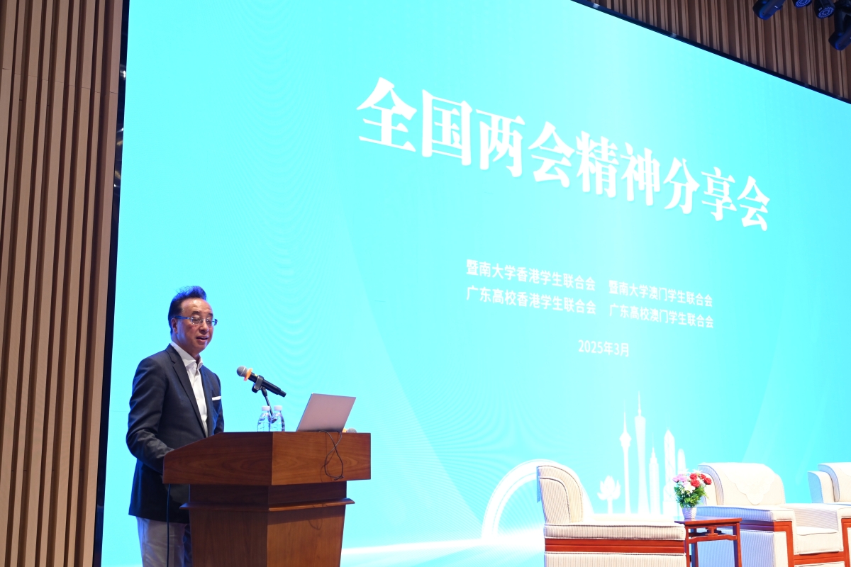 香港新聞網3月28日電 27日,在暨南大學舉行的全國兩會精神分享會上,全國政協港澳台僑委員會副主任、香港新時代發展智庫主席屠海鳴和全國政協委員、澳門特區立法會議員林倫偉與近300名港澳學生和暨大教師面對面,傳達學習2025年全國兩會精神,分享參會體會心得。 屠海鳴圍繞“‘一國兩制’實踐進入新階段”、中央賦予港澳“深化國際交往合作”新使命、提升大灣區區域創新能力和輻射帶動作用、香港在人工智能浪潮中的新作為等主題做了詳細闡釋,並對香港在中國式現代化中的角色、港人的機遇進行了多角度剖析。