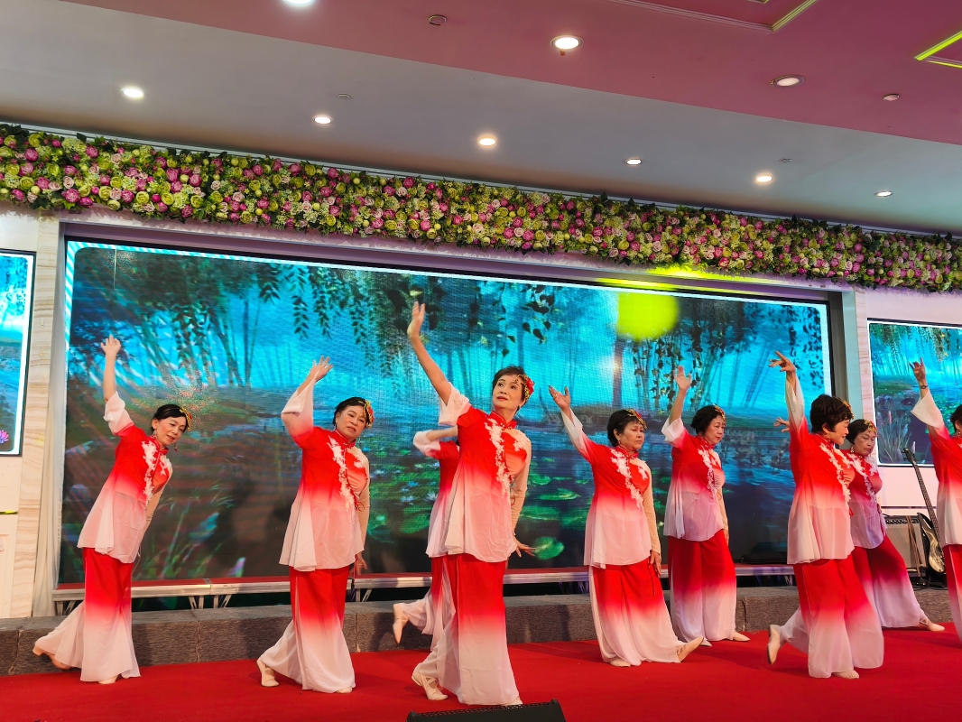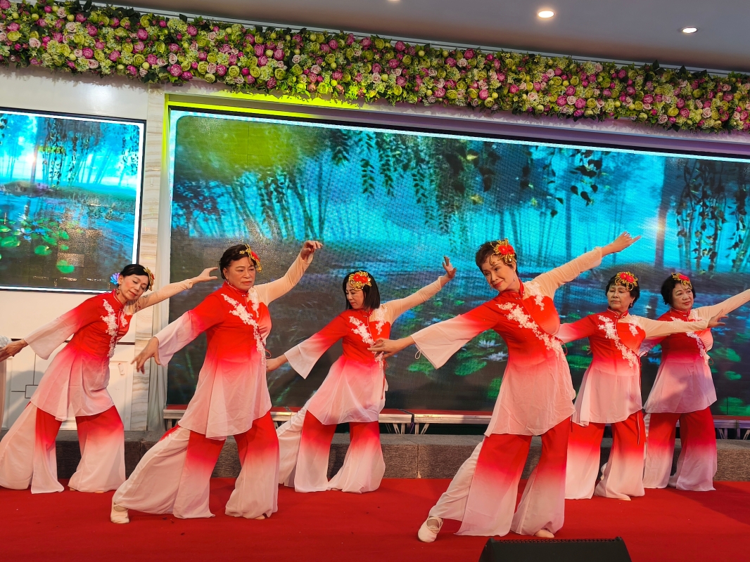 黃月娥老師及學生表演拉丁舞 聯歡會上僑友們載歌載舞,精彩節目紛呈。席間更有抽獎和各項表演,不少歸僑跳起拉丁舞、印尼、尼泊爾舞蹈……。