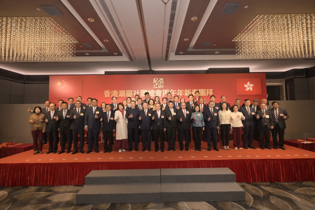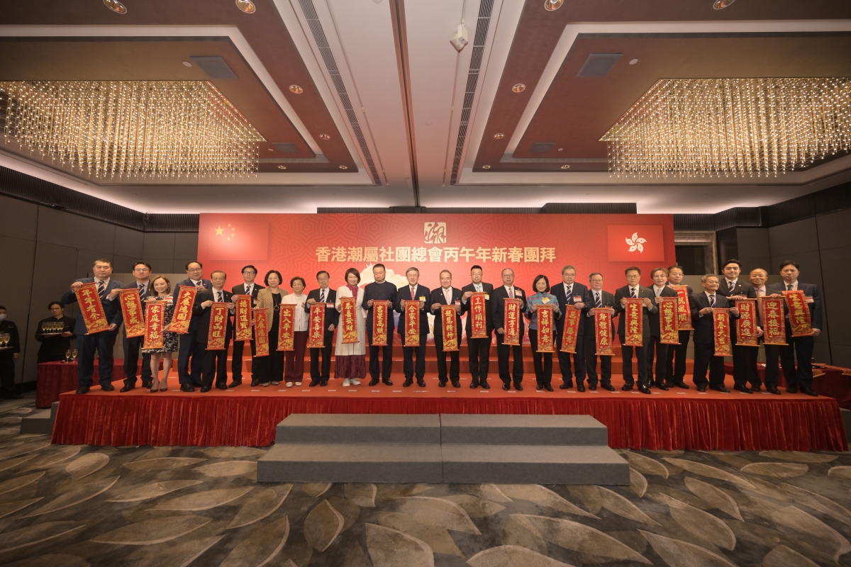 香港潮屬社團總會主席胡定旭致新年賀辭,代表香港潮屬社團總會向特區政府官員、中聯辦領導、社會各界及鄉親致以新春祝福。他指出,“老馬識途”是閱歷與沉澱,“龍馬精神”是奮鬥與擔當,潮總自陳偉南先生創會以來薪火相傳,各項工作離不開各方支持。潮總秉持“團結潮人、紮根香港、凝聚力量、攜手並進”的宗旨,推動潮州文化傳承,開展基層關愛、獎助學金等公益,鼓勵鄉賢參政議政,展現潮人家國情懷。2026年是國家“十五五”規劃開局之年,潮總將堅定擁護“一國兩制”,支持特區政府依法施政,發揮“內聯外通”優勢,擔當“超級聯繫人”“超級增值人”,講好中國故事、香港故事和潮人故事,助力香港融入國家發展大局,並推動青年傳承創新,續寫潮人事業新篇章。